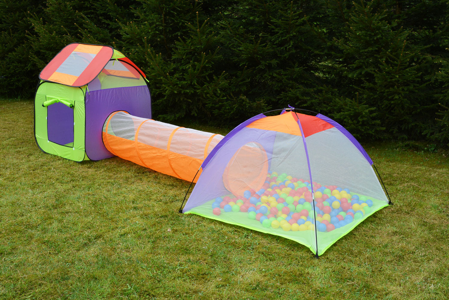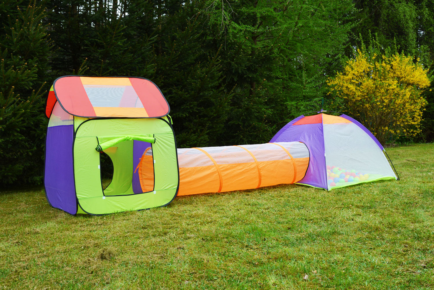 Puteti avea un teren de joaca propriu acasa, succesul este garantat! Cortul de joaca este alcatuit din 3 parti, un cort cu acoperis, un cort patrat si tunel de legatura.