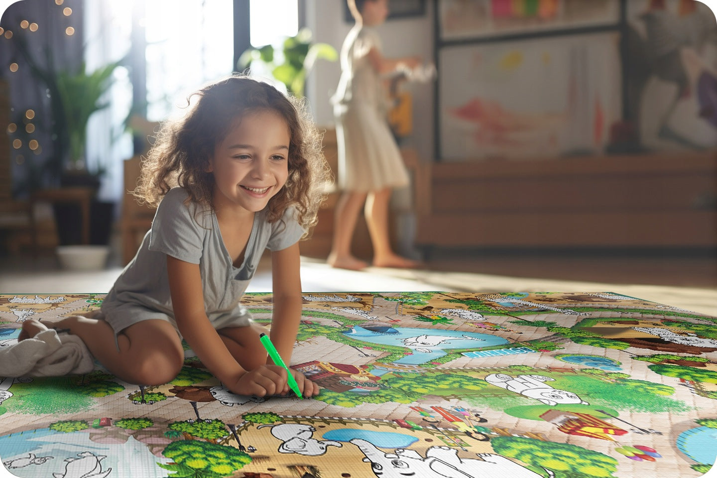 Acest covoras nu este doar un spatiu de joaca, ci si o carte de colorat fascinanta care dezvolta imaginatia si abilitatile manuale ale copilului. Pe langa faptul ca ii ofera micutului tau confort in timp ce se joaca si invata sa se tarasca, ii va ajuta si la dezvoltarea creativitatii prin pictura.