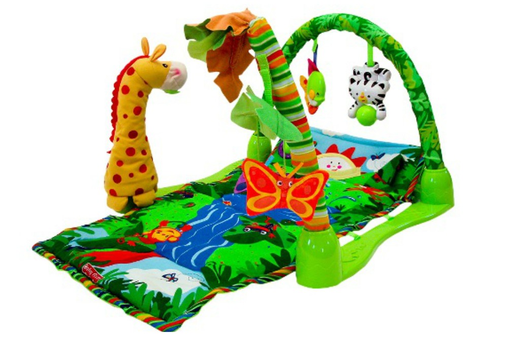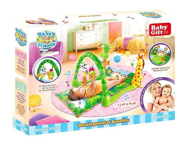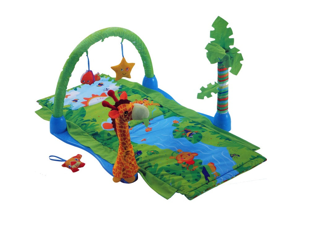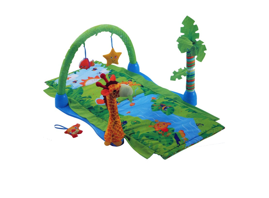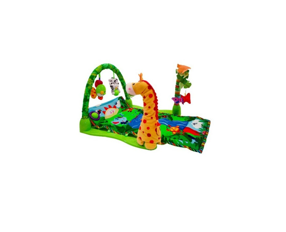 O girafa de plus cu zambet, fluturi din tesaturi si pesti, jucarii care fac sunetele interesante pentru micutul tau. Este o jucarie interactiva care dezvolta capacitatea copilului pe trei nivele: