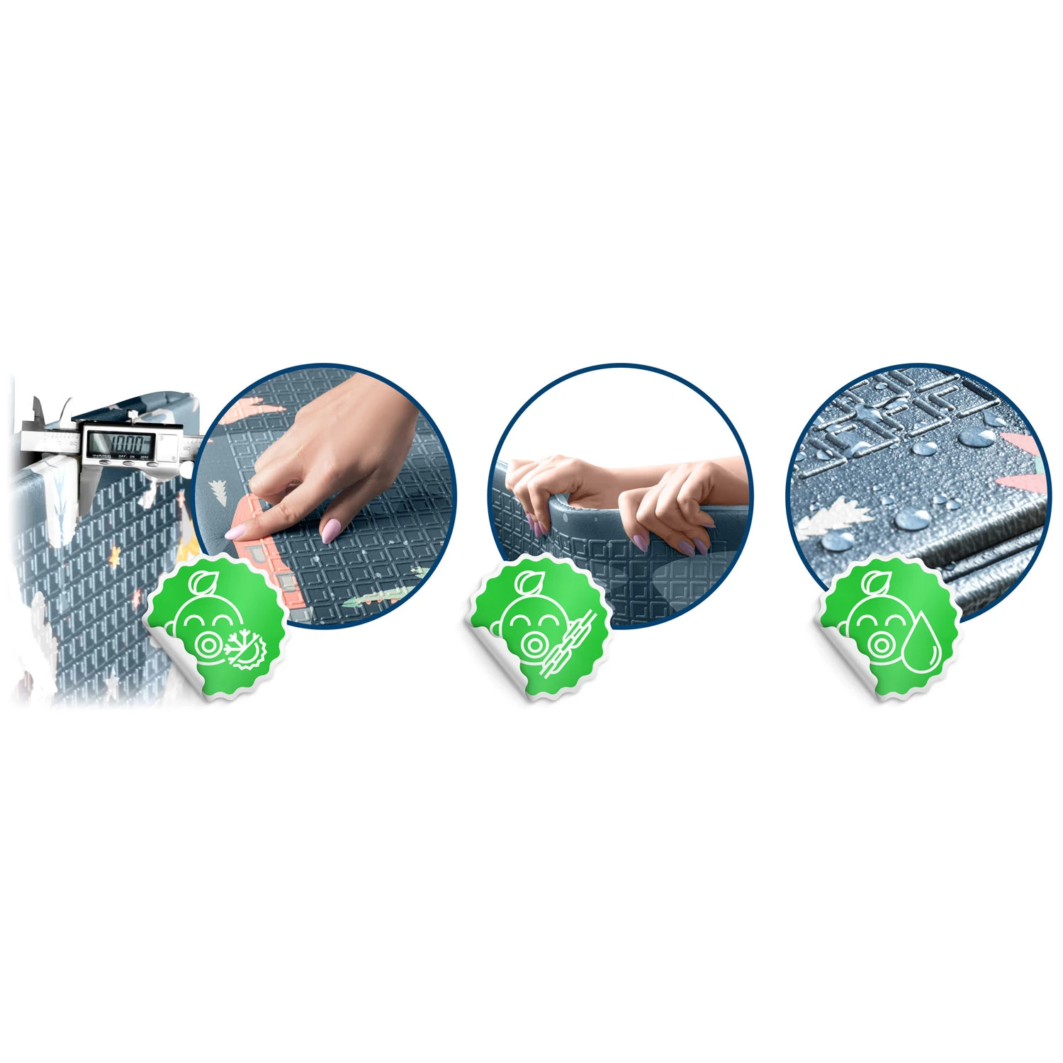 - Spuma speciala din interiorul covorasului absoarbe socul, atenuand loviturile, si izoleaza termic.