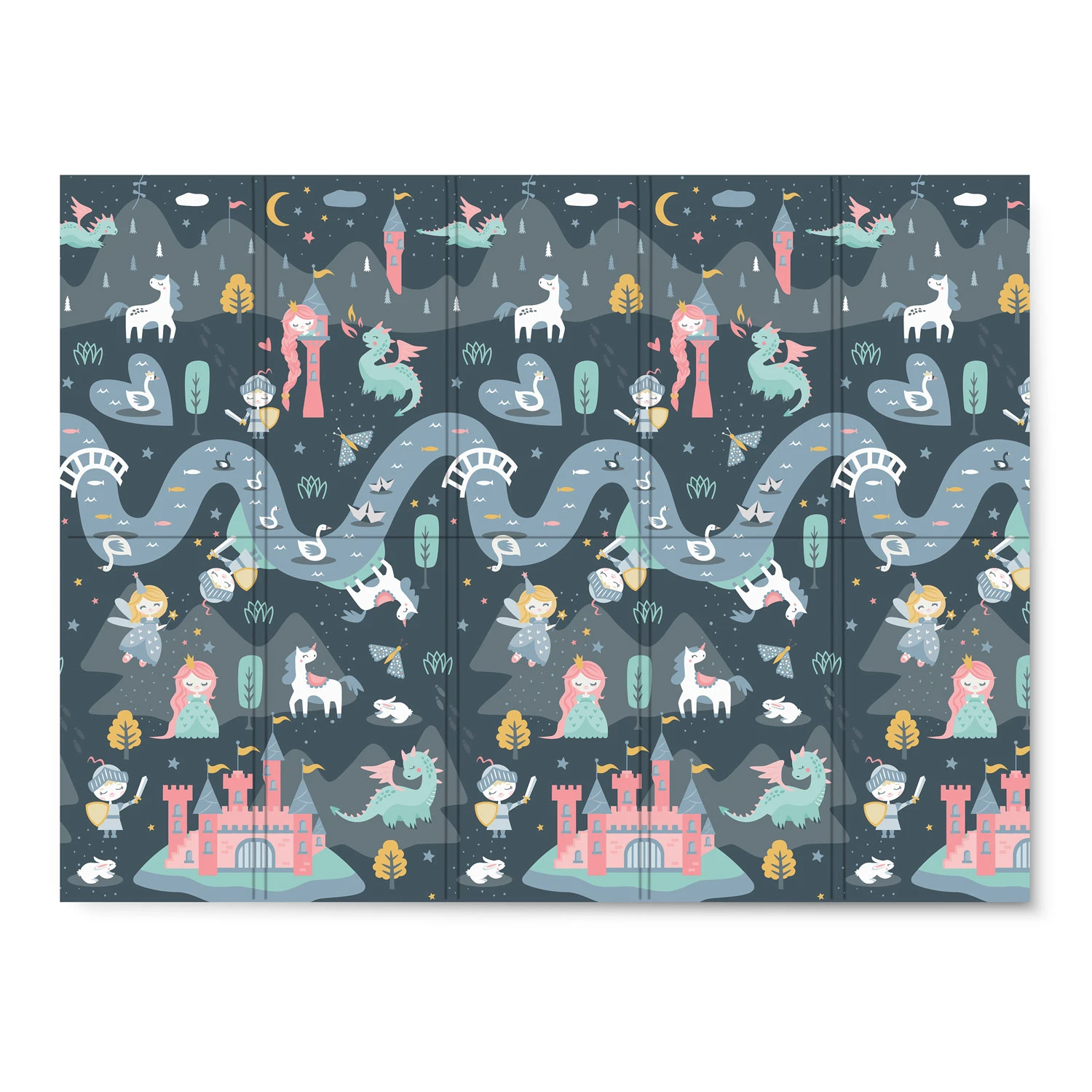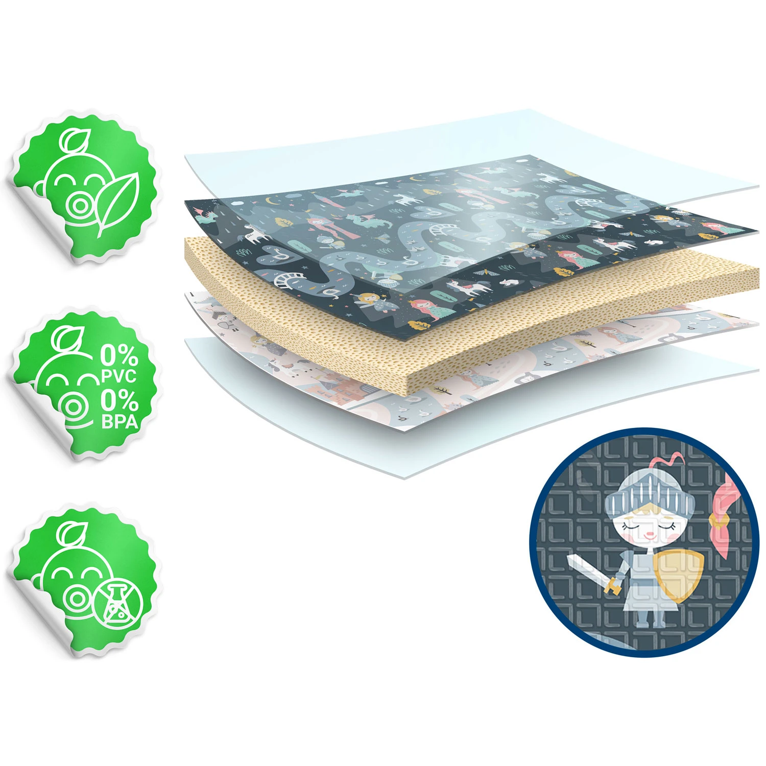 Cele doua fete a covorasului au imprimeuri diferite, astfel ca daca bebe se plictiseste de un model, puteti intoarce covorasul invers si bebe va fi incantat sa descopere noi lucruri.