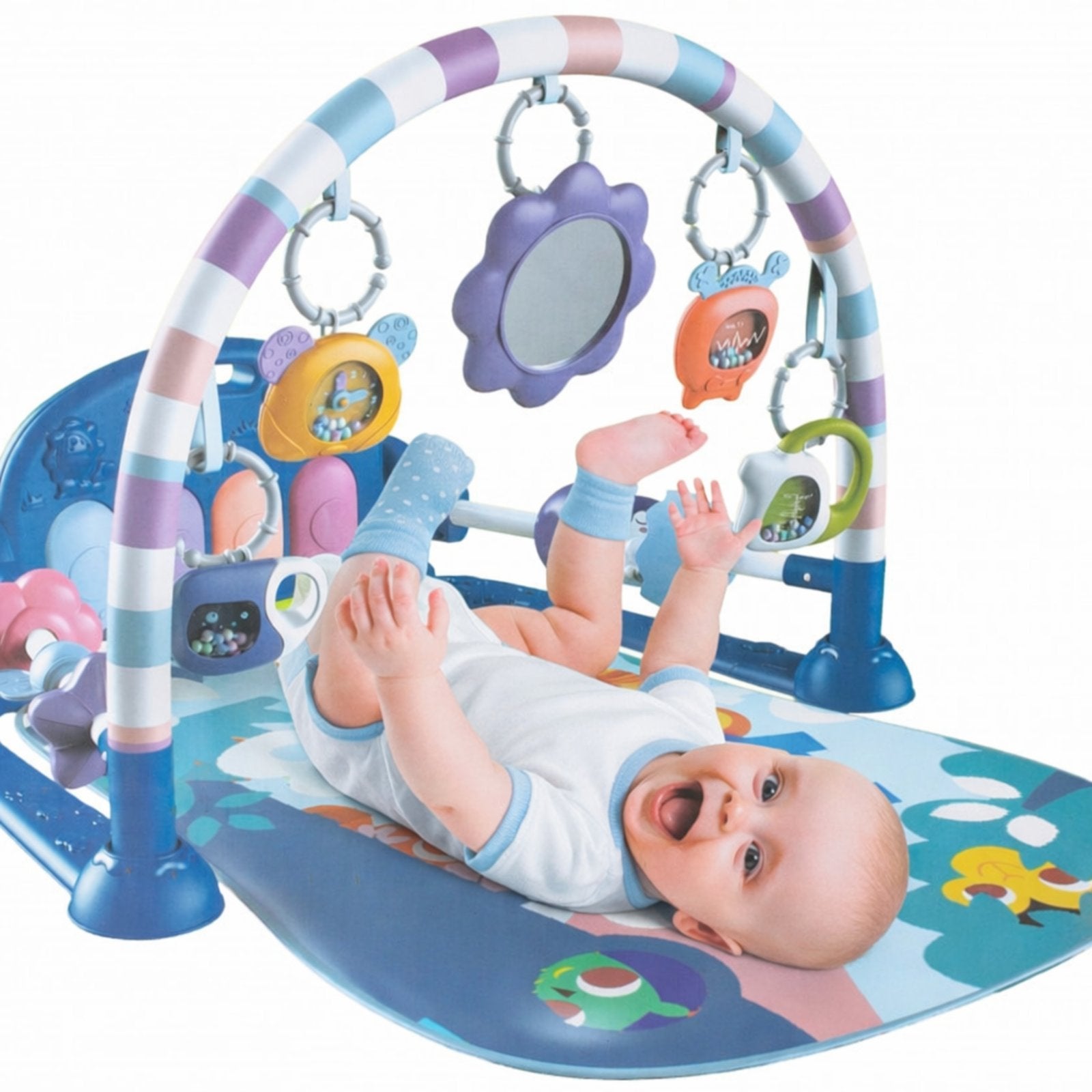 4 zornaituri din plastic si o oglinda deasupra capului atrag atentia copiilor, stimuland dezvolatarea motorii, a vederii si a reflexului de apucare, Pianul reda sunete amuzante.