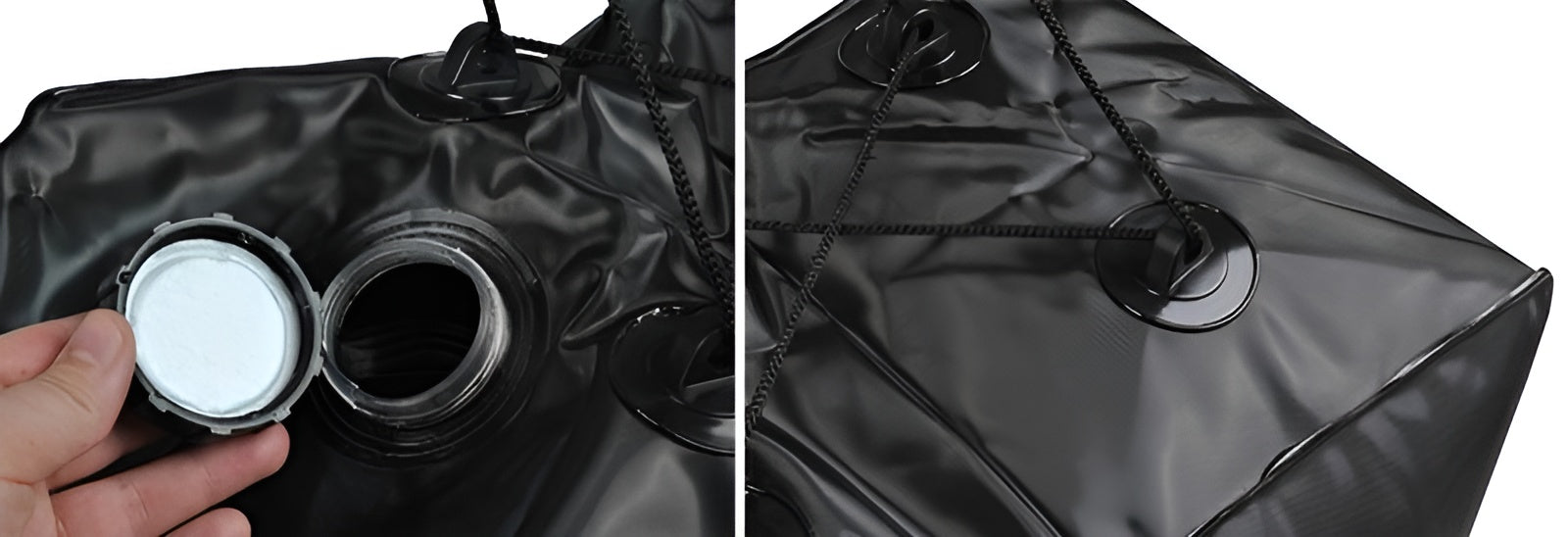 Datorita materialului negru, dusul absoarbe bine lumina, iar apa se incalzeste rapid la soare . Materialul este impermeabil, iar dopul strans face ca dusul sa fie depozitat in siguranta.