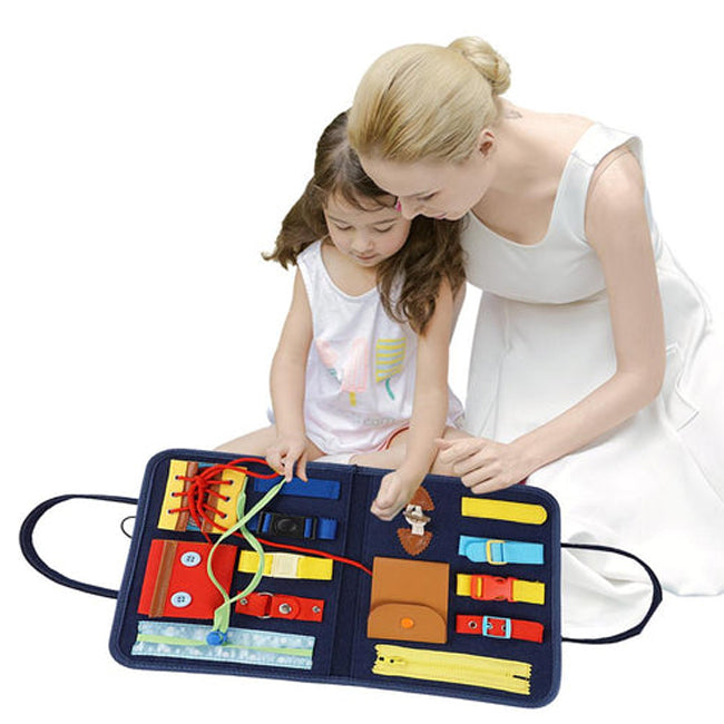 Geanta tip carte senzoriala cu 14 activitati diferite, concepute pe diferite niveluri de dificultate pentru a fi o provocare si a mentine interesul celor mici.