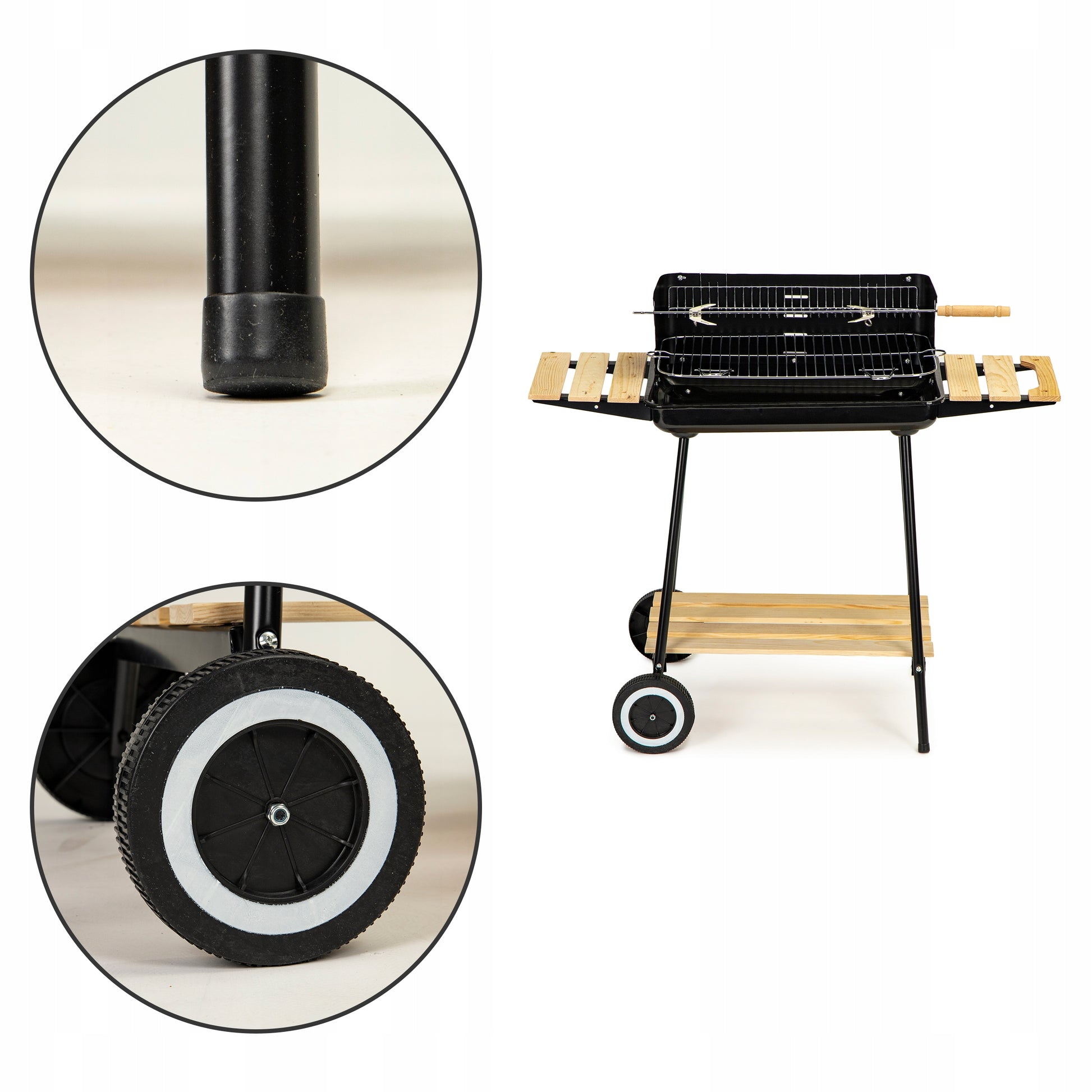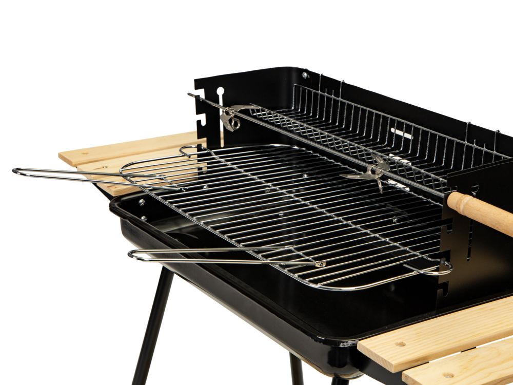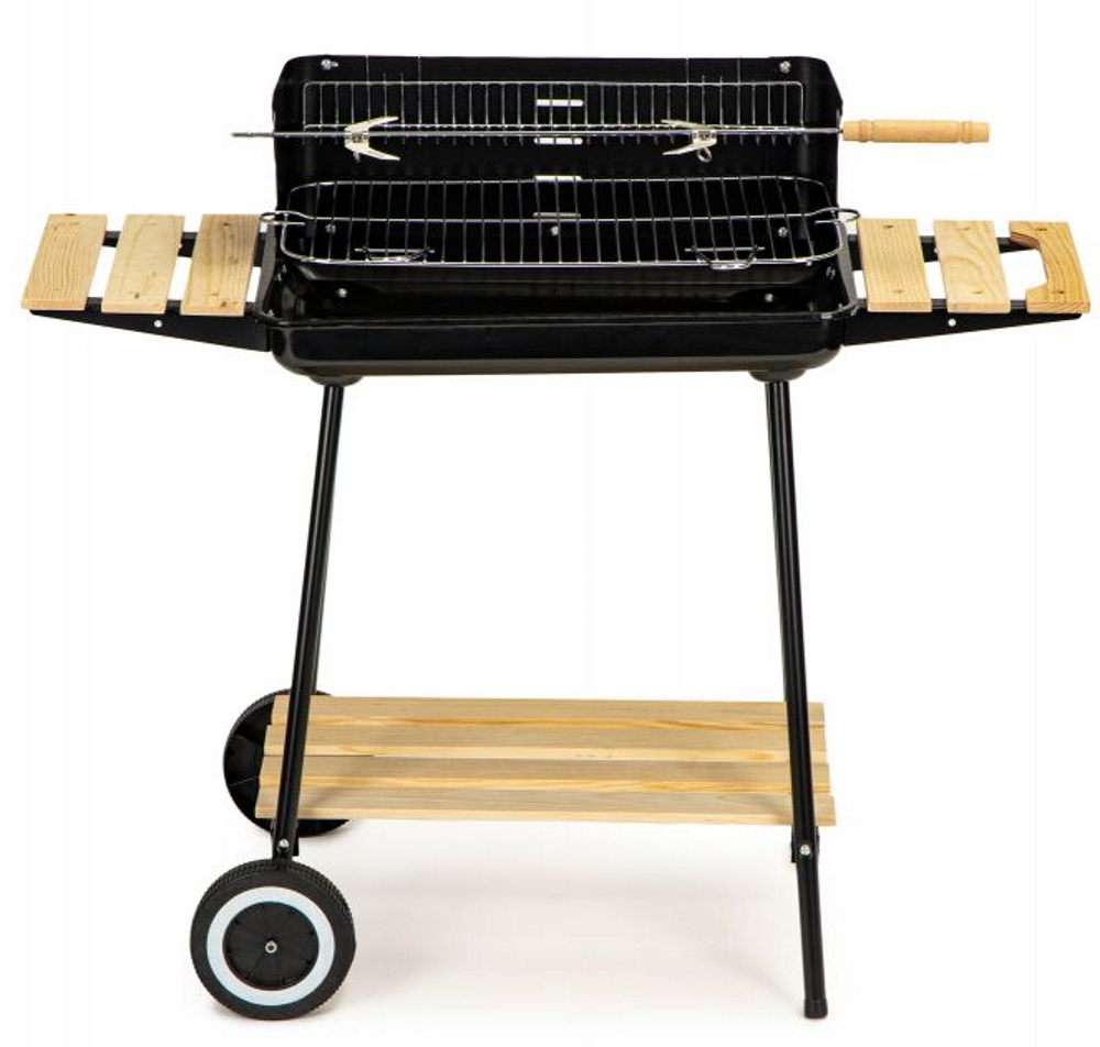 Gratar Profesional Modern Home idealSTORE cu Carbuni si Rotisor, Dimensiuni 86 x 37 x 84, Inaltime Reglabila pe 4 nivele, Structura Metalica Stabila, Echipat cu 3 Rafturi din lemn, Roti si Maner pentru Transport