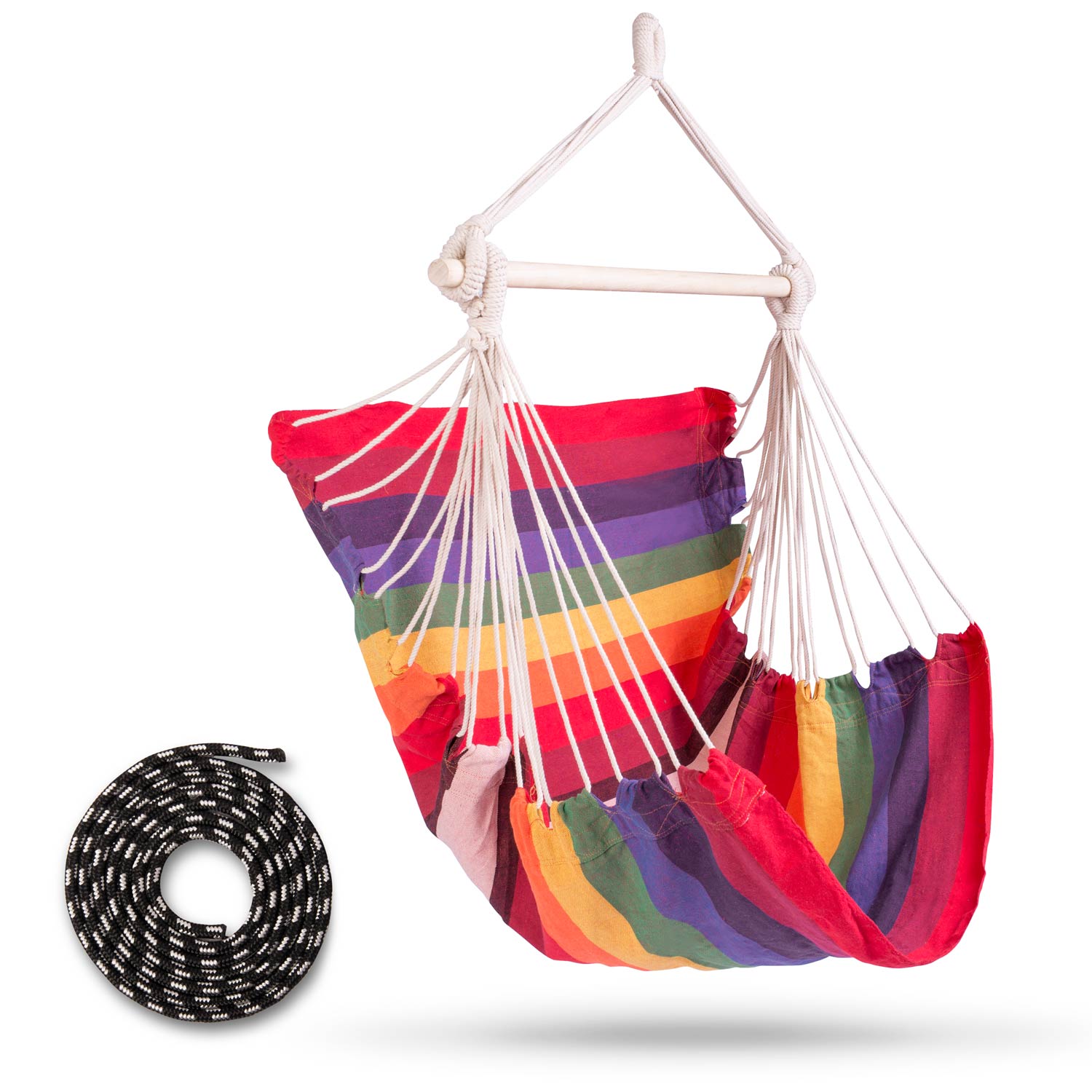 Hamac suspendat tip scaun RhoDes idealSTORE, Dimensiuni 130 x 112 X 98 cm, Include 1,5 m franghie, corzi groase impletite, Material din bumbac, respirabil, durabil si rezistent la abraziune, Sarcina maxima 150 KG, Ideal pentru terasa