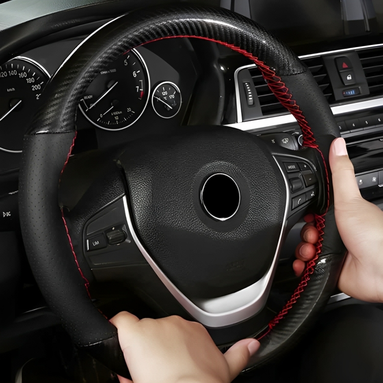 Husa volan IdealStore cu ac si ata piele cu gaurele marime: M Culoare: negru + carbon cu cusatura rosie - PREMIUM