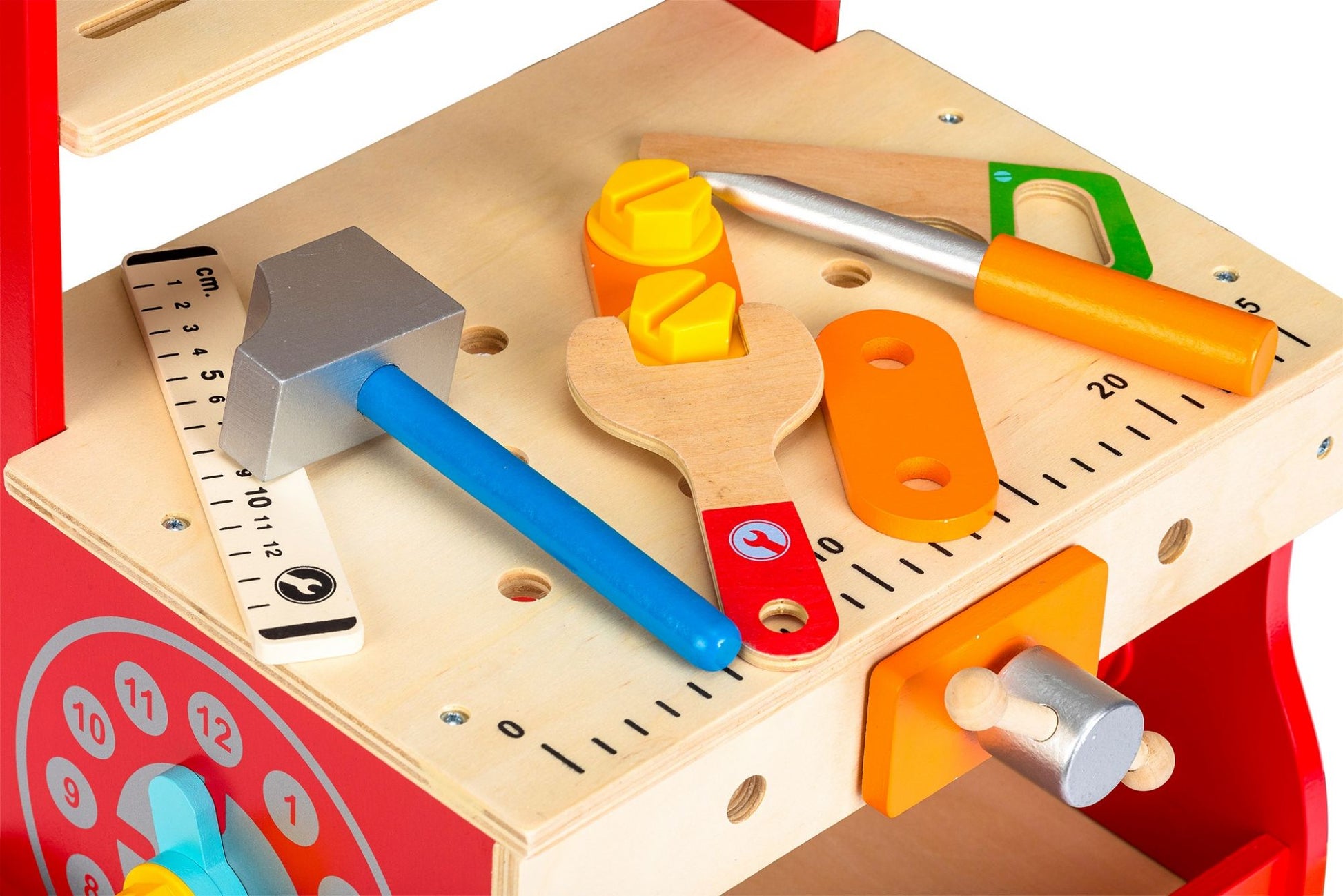 Impingator din Lemn tip Banc de lucru idealSTORE RED Residence WORK, Dimensiuni 48.5 x 32 x 28.5 cm, Echipat cu accesorii specifice ciocan, cheie, surubelnita si ferastrau, Dezvolta abilitatile manuale
