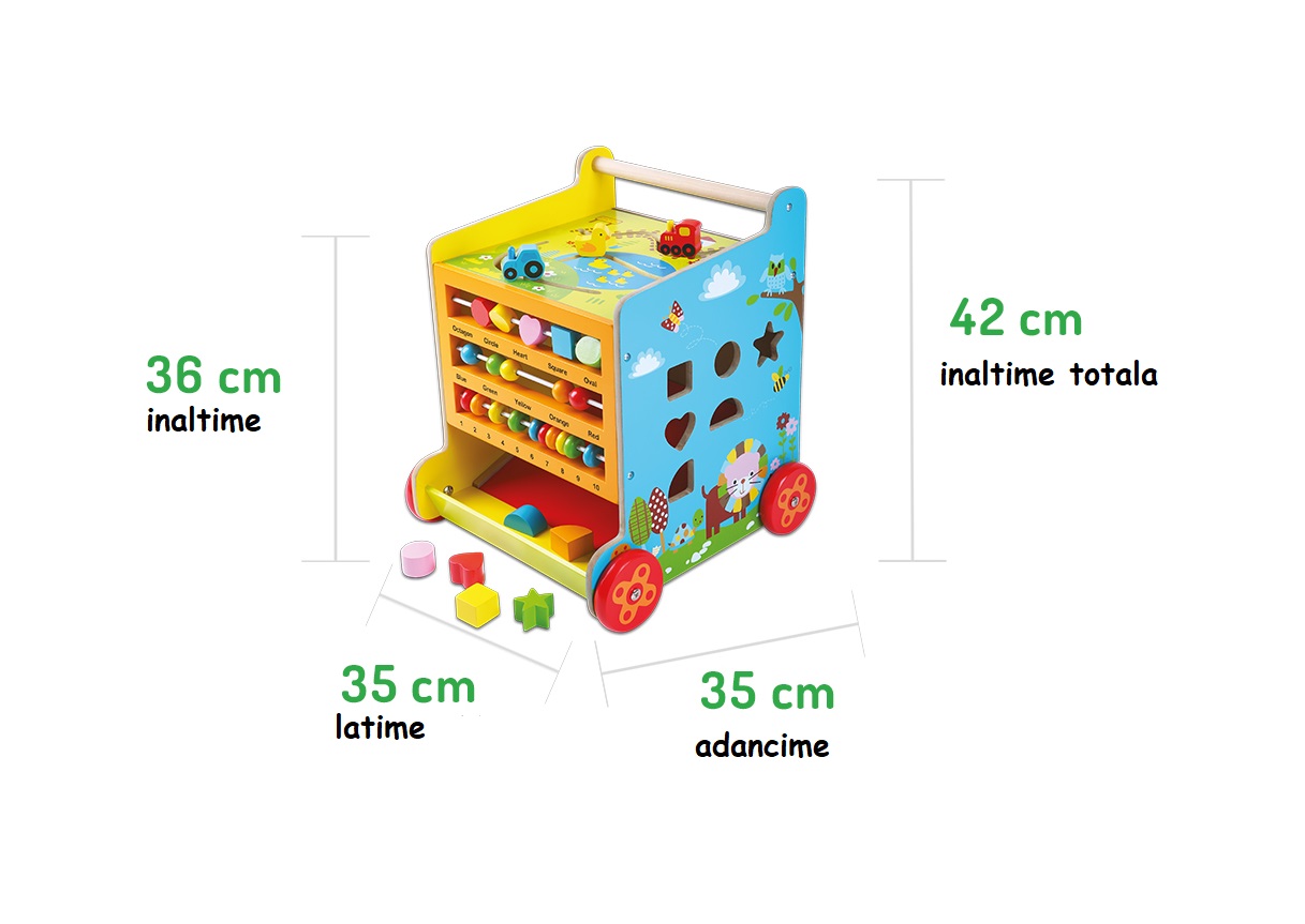 Impingator Educational din lemn tip Cub idealSTORE, Dimensiuni 42 x 35 x 35 cm, Dezvolta abilitatile motrii ale copilului, Echipat cu pereti care au functionalitate si caracter complet diferit, Insotior al primelor plimbari