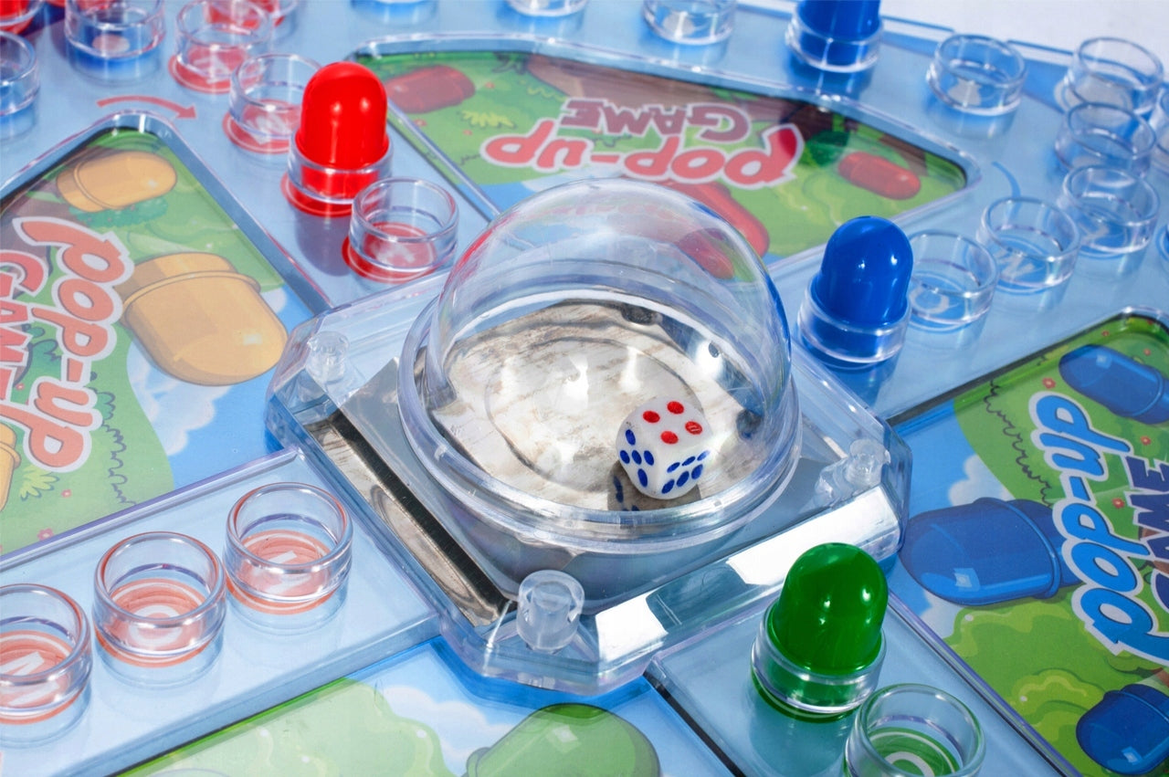 Joc de Familie POP-UP Game idealStore, Tabla de Joc Colorata, Dimensiuni 26 x 26 cm, 16 Piese Colorate, Zaruri Incluse, Joc Interactiv si Distractiv