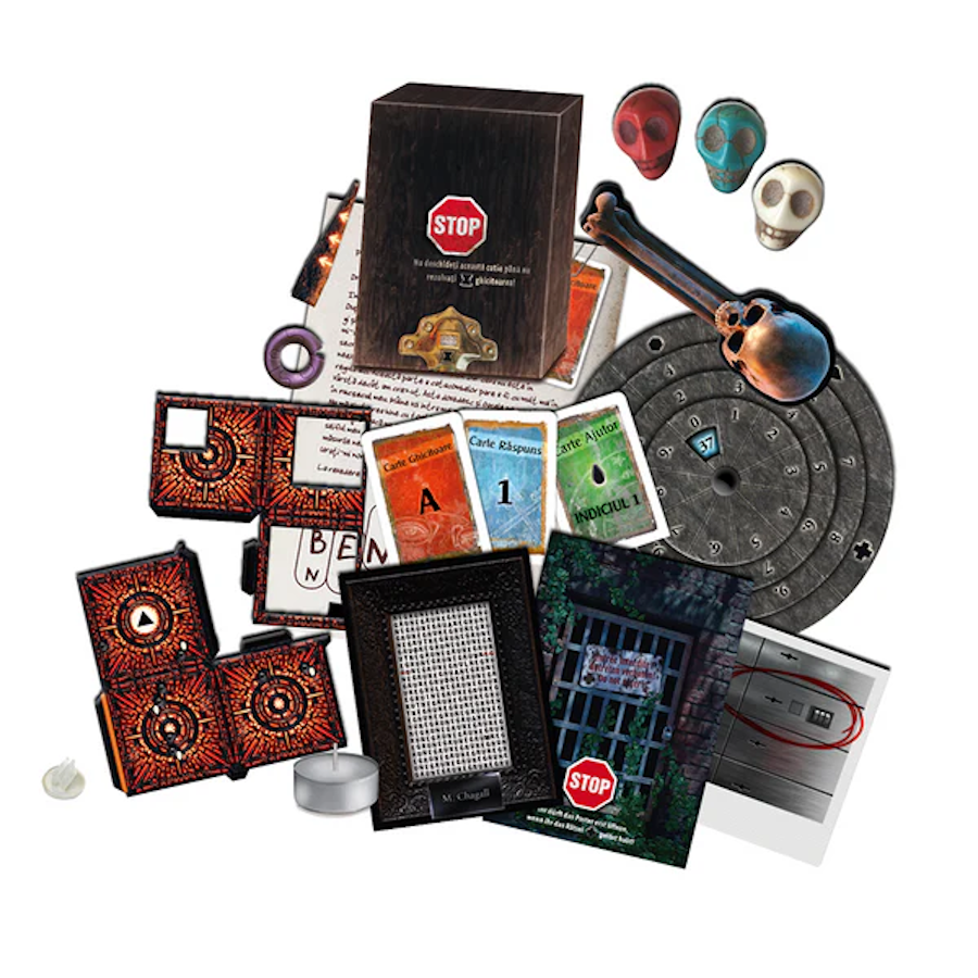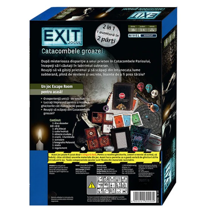 Joc de Societate Catacombele Groazei idealSTORE, Nivel Avansat, Reusiti sa va gasiti Prietenul si sa Scapati din Intunecata Lume Subterana, 118 Carti, 3 Cranii, Stativ, Regulament