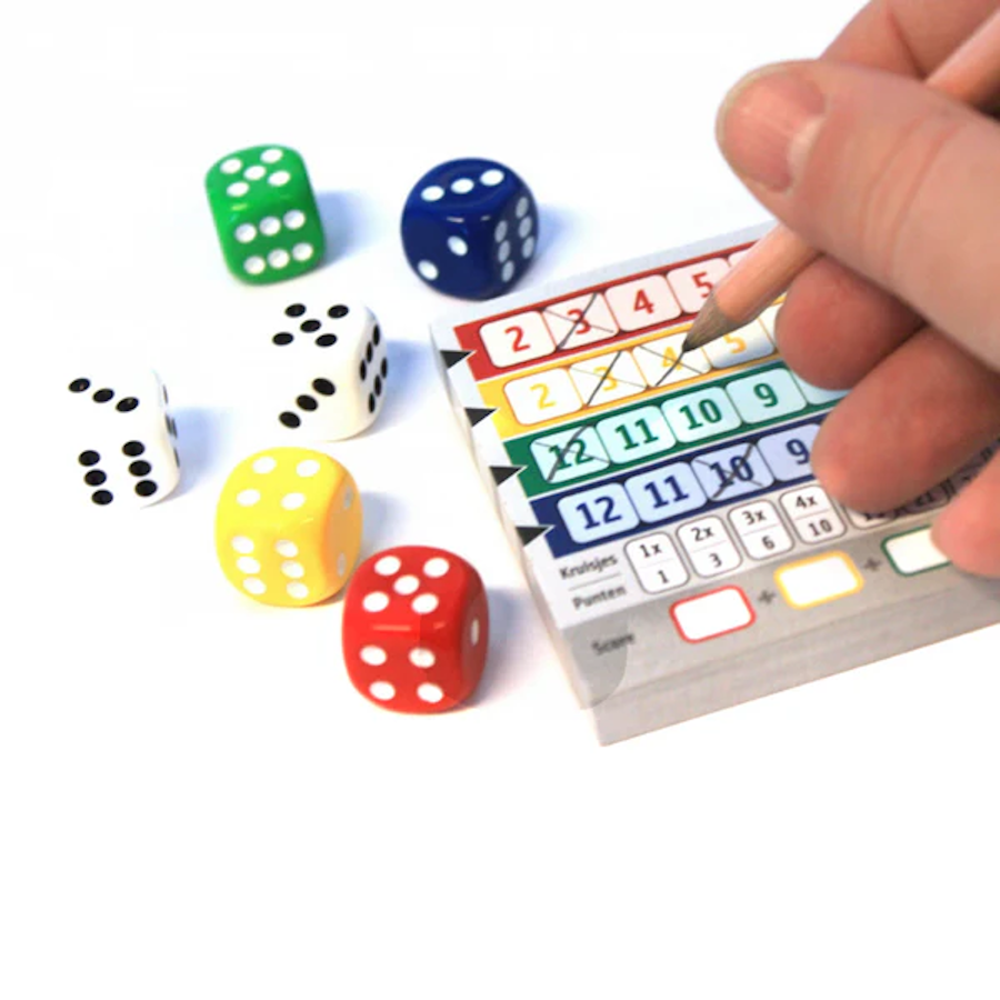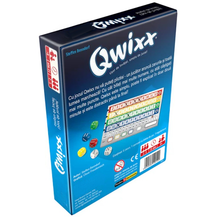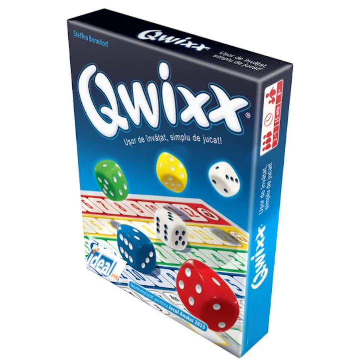 Joc de societate Qwixx idealSTORE, Arunca cu Zarurile si Bifeaza cat mai multe Puncte, 2-5 Jucatori, 6 Zaruri, 1 Carnetel cu Bilete de Joc, 1 Regulament