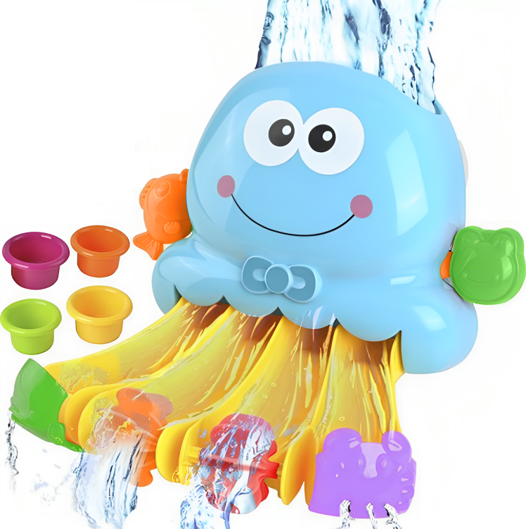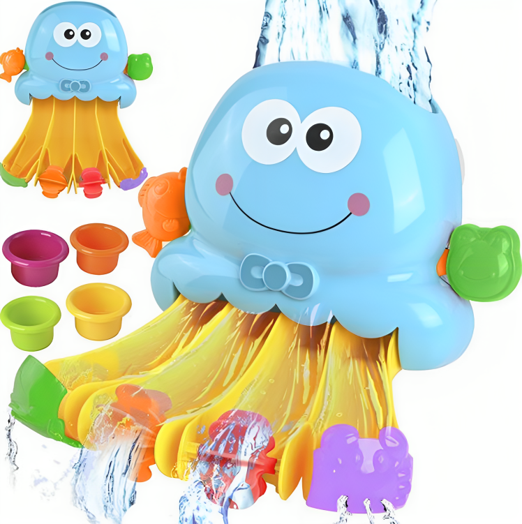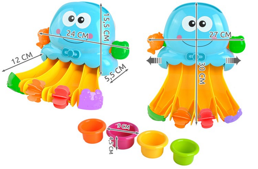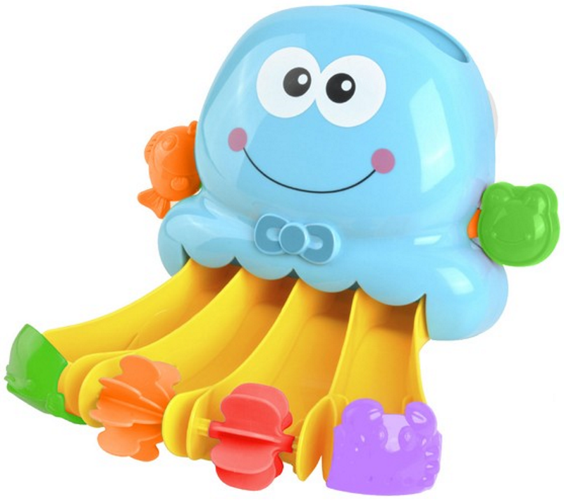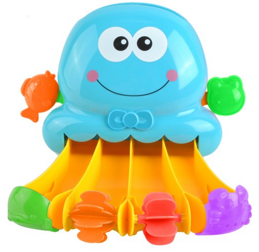 O caracatita de baie este o jucarie colorata, al carei principiu principal este sa toarne apa. Rezervorul situat in partea principala a jucariei ar trebui sa fie umplut cu apq , iar apoi curgerea acestuia trebuie pornita tragand doua incuietori in lateral. Tema principala a cascadei este o caracatita albastra, cu o broasca si un peste pe ambele parti ale acesteia.