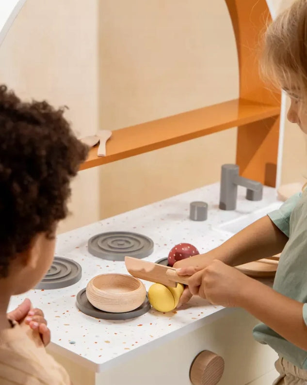 Un set de fructe colorate intr-o cutie este o completare excelenta a distractiei pentru micii bucatari carora le place sa se joace acasa, la magazin sau sa gateasca.