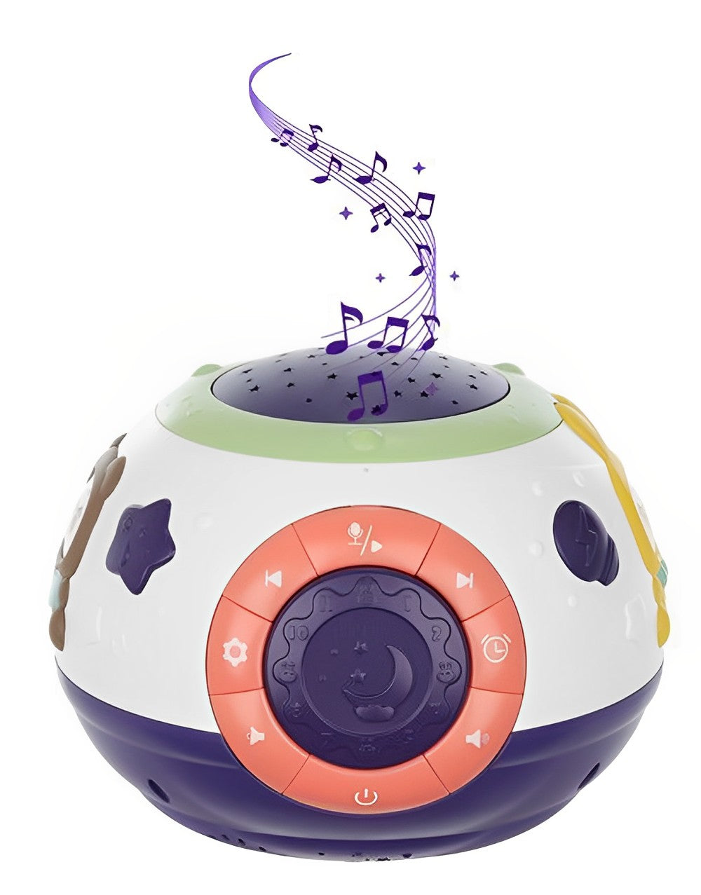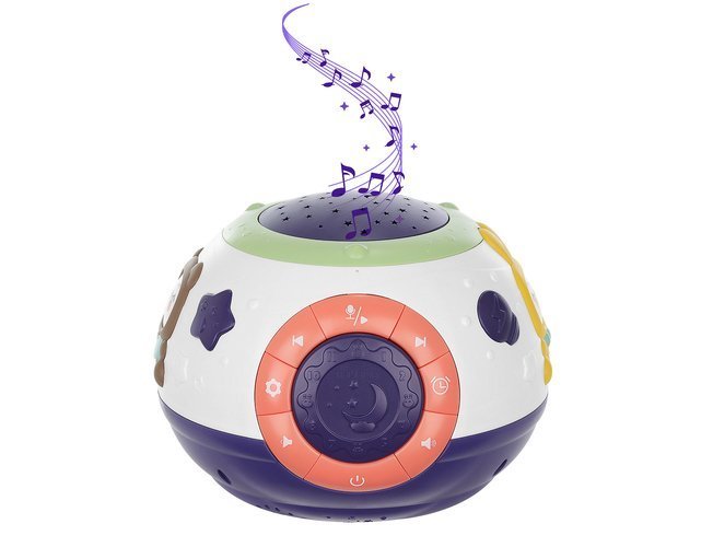 Produsul nostru fermecator este o combinatie de 3 dispozitive necesare care ar trebui să fie in camera fiecarui bebelus: o lampa de noptiera, un proiector si o cutie de muzica. Formele sale rotunjite si marginile netede vor permite amplasarea lampii in siguranta in camera copilului, fara riscul ca acesta, de exemplu, sa taie un deget. Este realizat in intregime din plastic, ceea ce il face durabil si nu se va rupe.