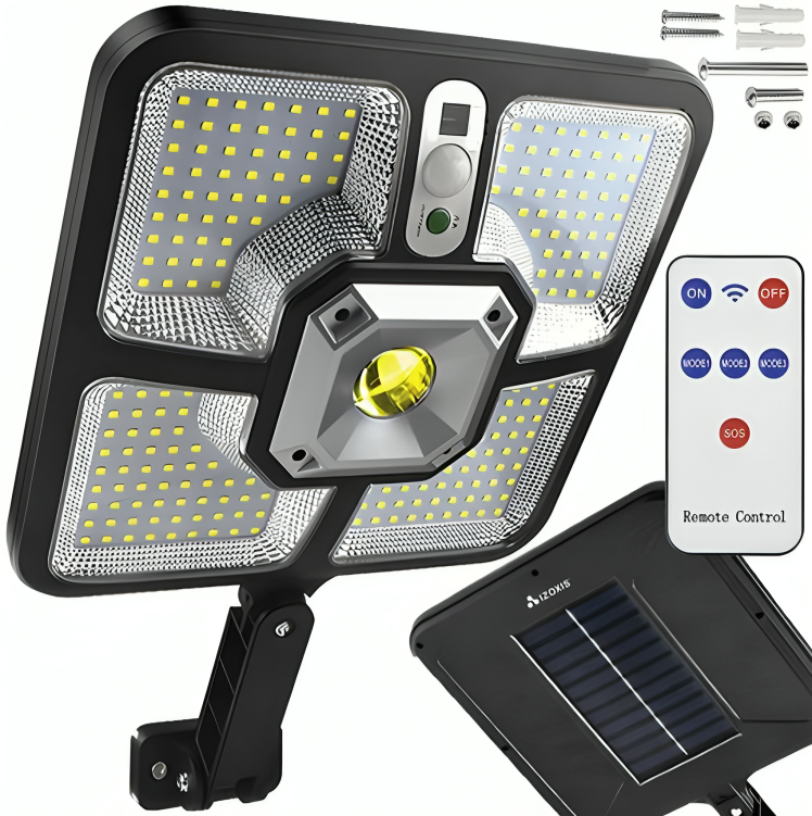 Lampa Solara cu Telecomanda idealSTORE, Dimensiuni 36,5 x 23 x 4,5 cm, Compusa din 4 segmente de 55 de diode SMD, Senzor de Miscare 5m, WATERPROOF, 4 Moduri de Operare, Material ABS + plastic, Unghi de iluminare 120°, Putere 8W