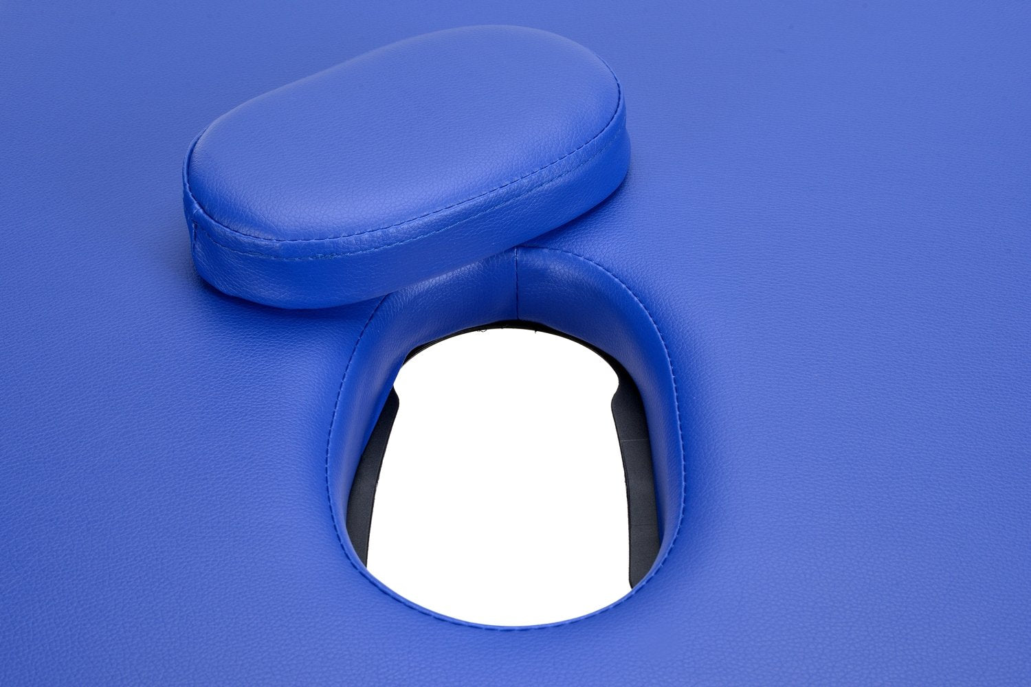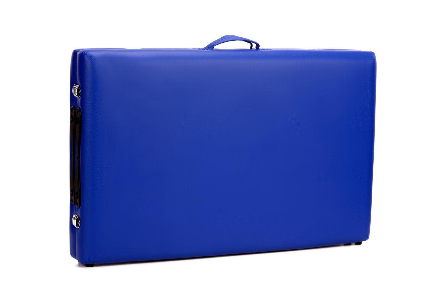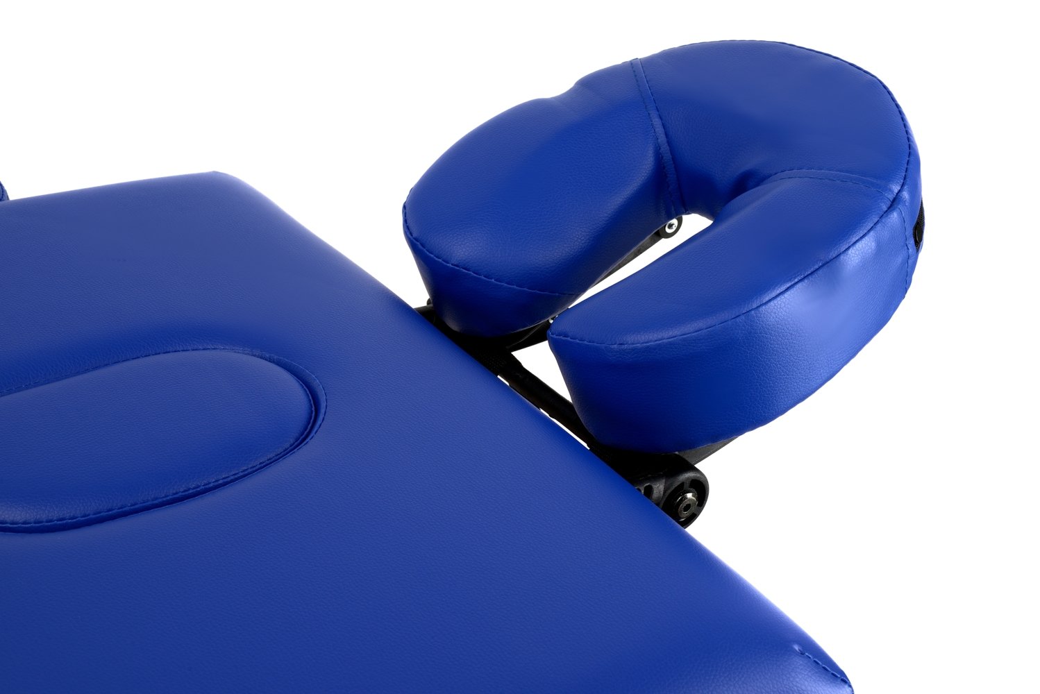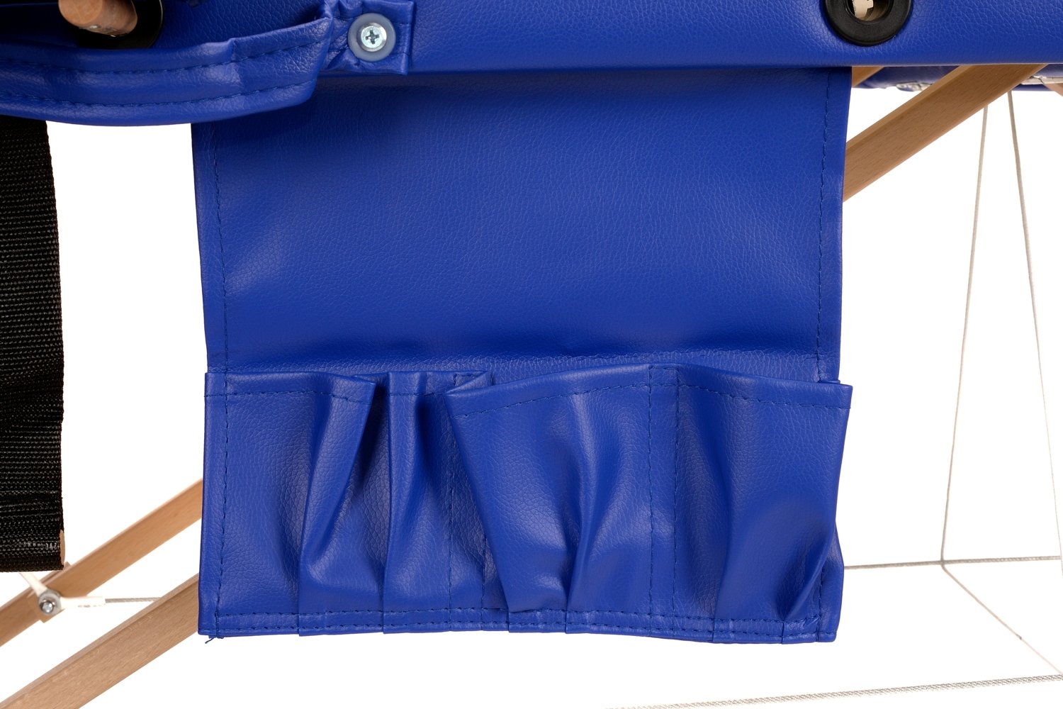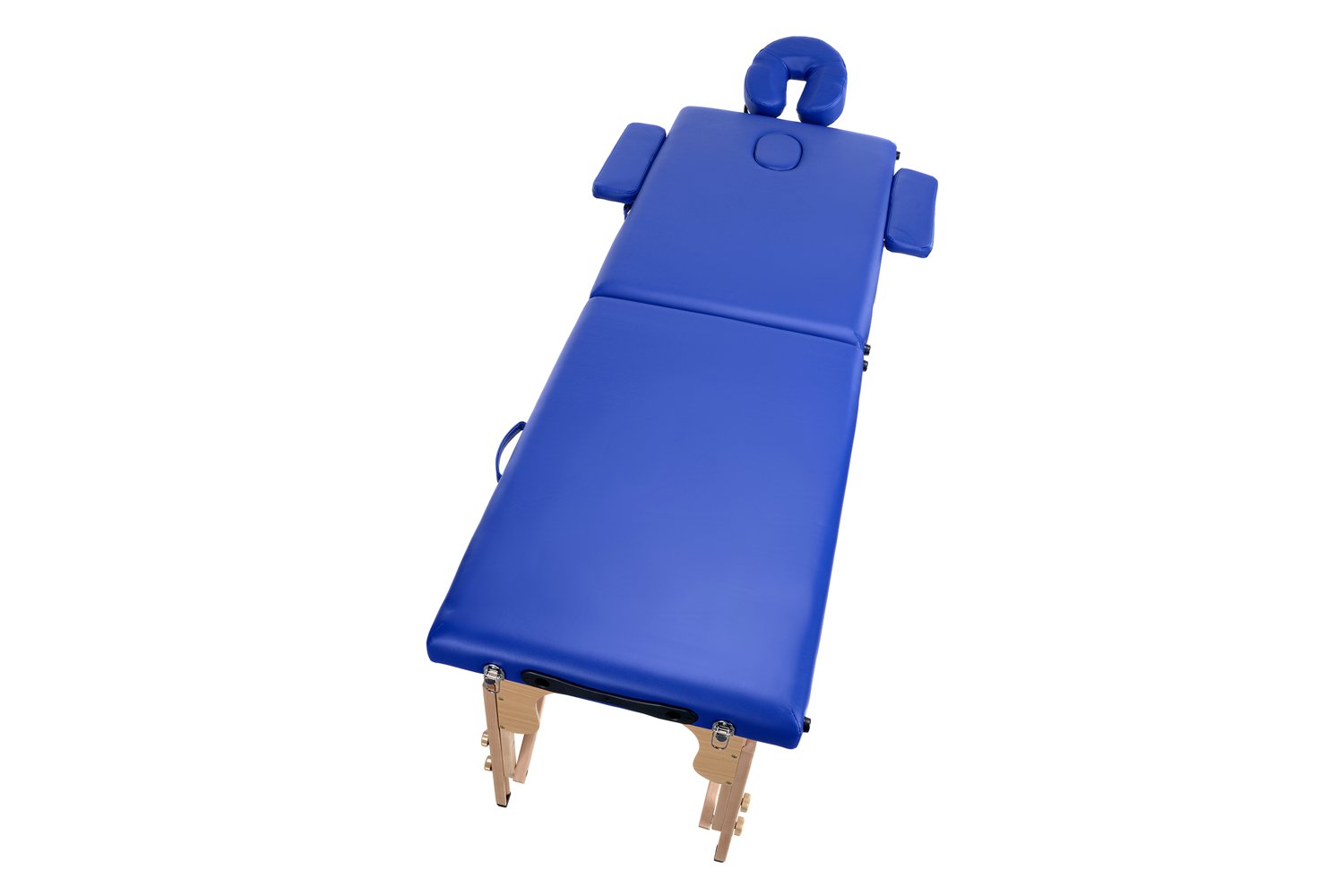 Masa de masaj pliabila idealSTORE, 2 segmente, Inaltime reglabila 62-84 cm, Piele ecologica moale, 2 cotiere laterale, Structura din lemn, Sarcina 250 KG, Rezistenta la uleiuri si apa, Include geanta de transport cadou, Albastru