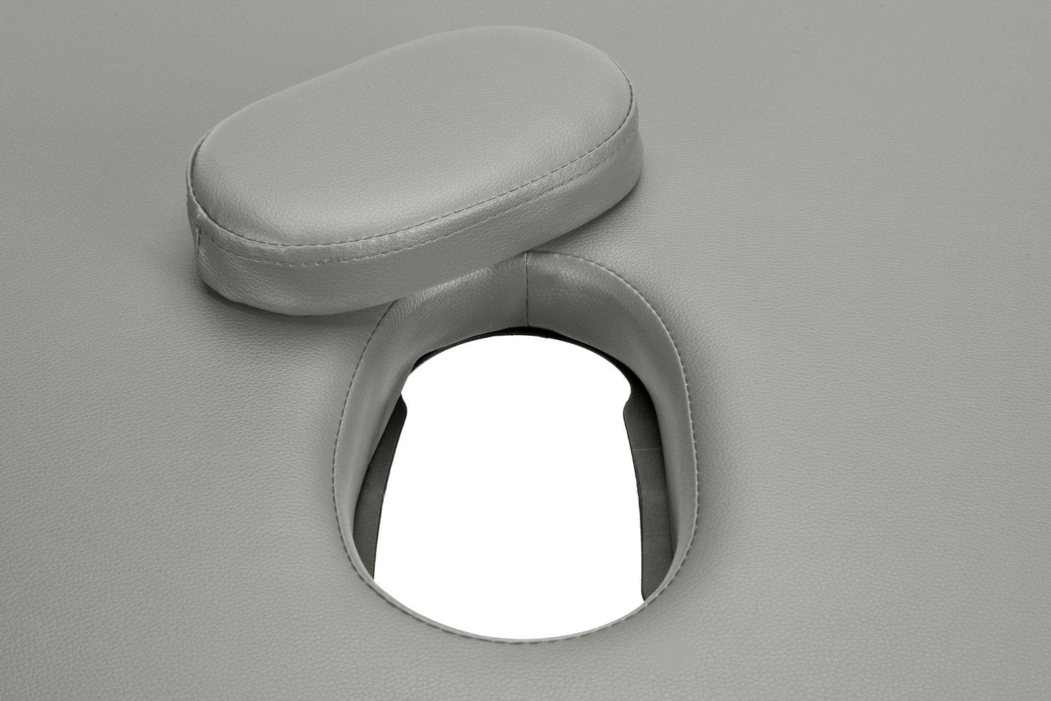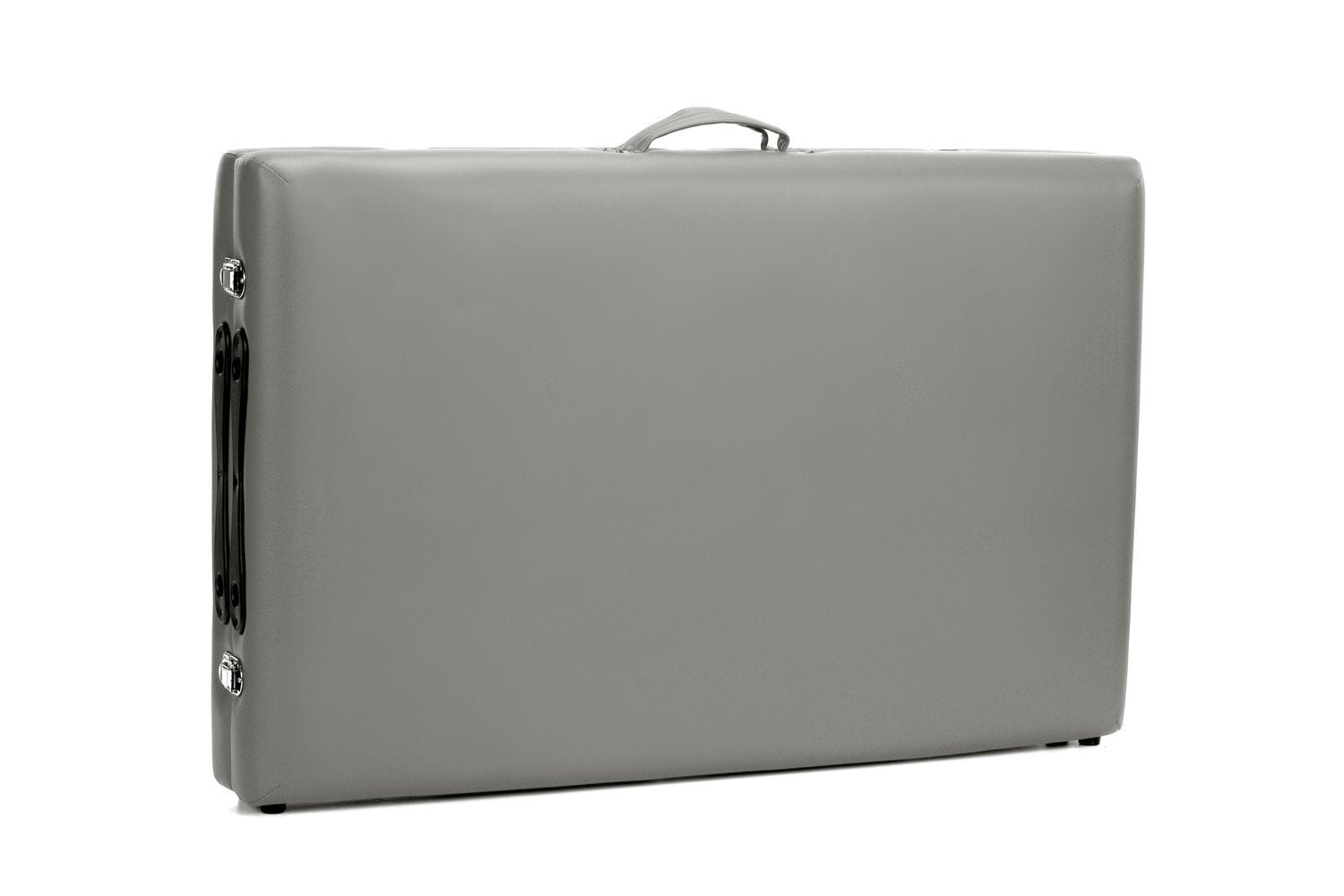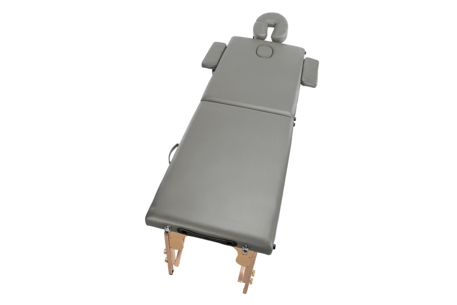 Masa de masaj pliabila idealSTORE, 2 segmente, Inaltime reglabila 62-84 cm, Piele ecologica moale, 2 cotiere laterale, Structura din lemn, Sarcina 250 KG, Rezistenta la uleiuri si apa, Include geanta de transport, Culoare Gri