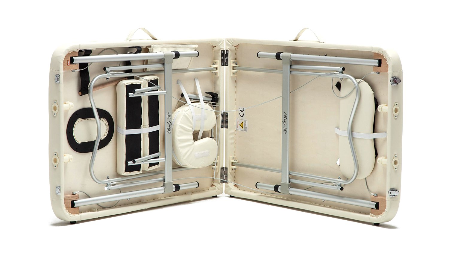 Patul, impreuna cu accesoriile din interior , se pliaza intr- o valiza inchisa cu catarame.