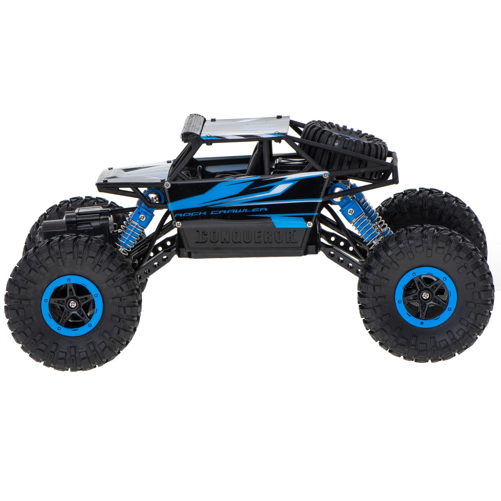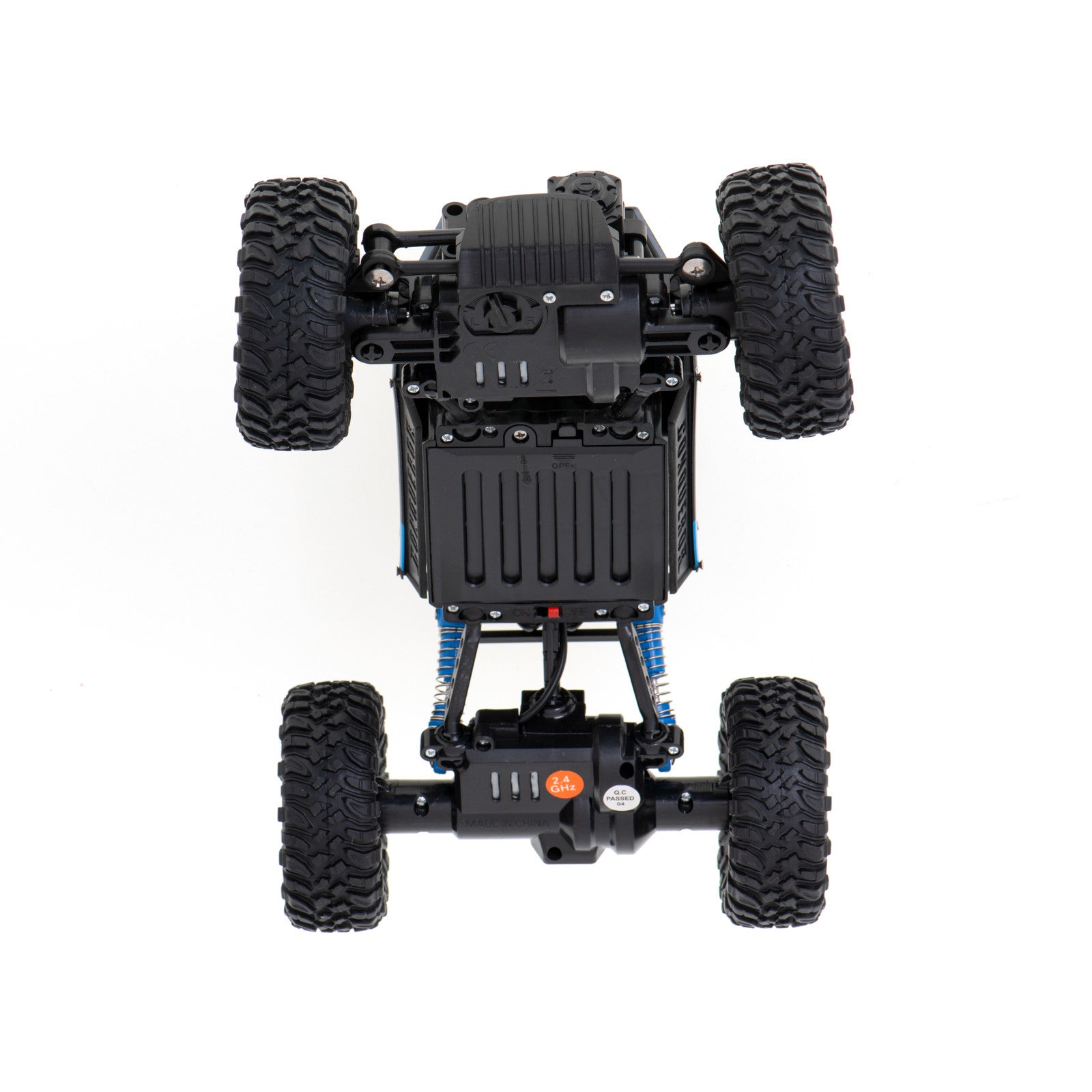 Masinuta cu Telecomanda Rock Through idealSTORE, Accesorizat cu 2 Motoare Puternice, Roti mari de Teren, 4X4, Suspensii, Viteza ~10 km/h, Raza de Actiune 50 m, Scara 1:18, GHz 2,4 Ofera multe Ore De Distractie, Albastru- Negru