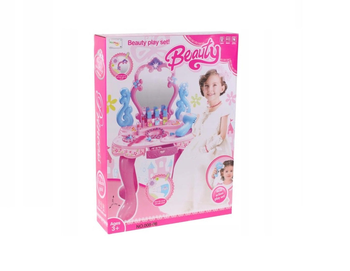 Surprinde-ti mica printesa cu un set de infrumusetare superb! Acesta este compus din masuta cu oglinda, scaun si multe accesorii simbolice. Setul reprezinta un joc de rol minunat, pentru formarea imaginii/stimei de sine si dezvoltarea imaginatiei. Cu un design atractiv si colorat, setul va deveni jucaria preferata a fetitei tale! Setul are diverse lumini si muzica.