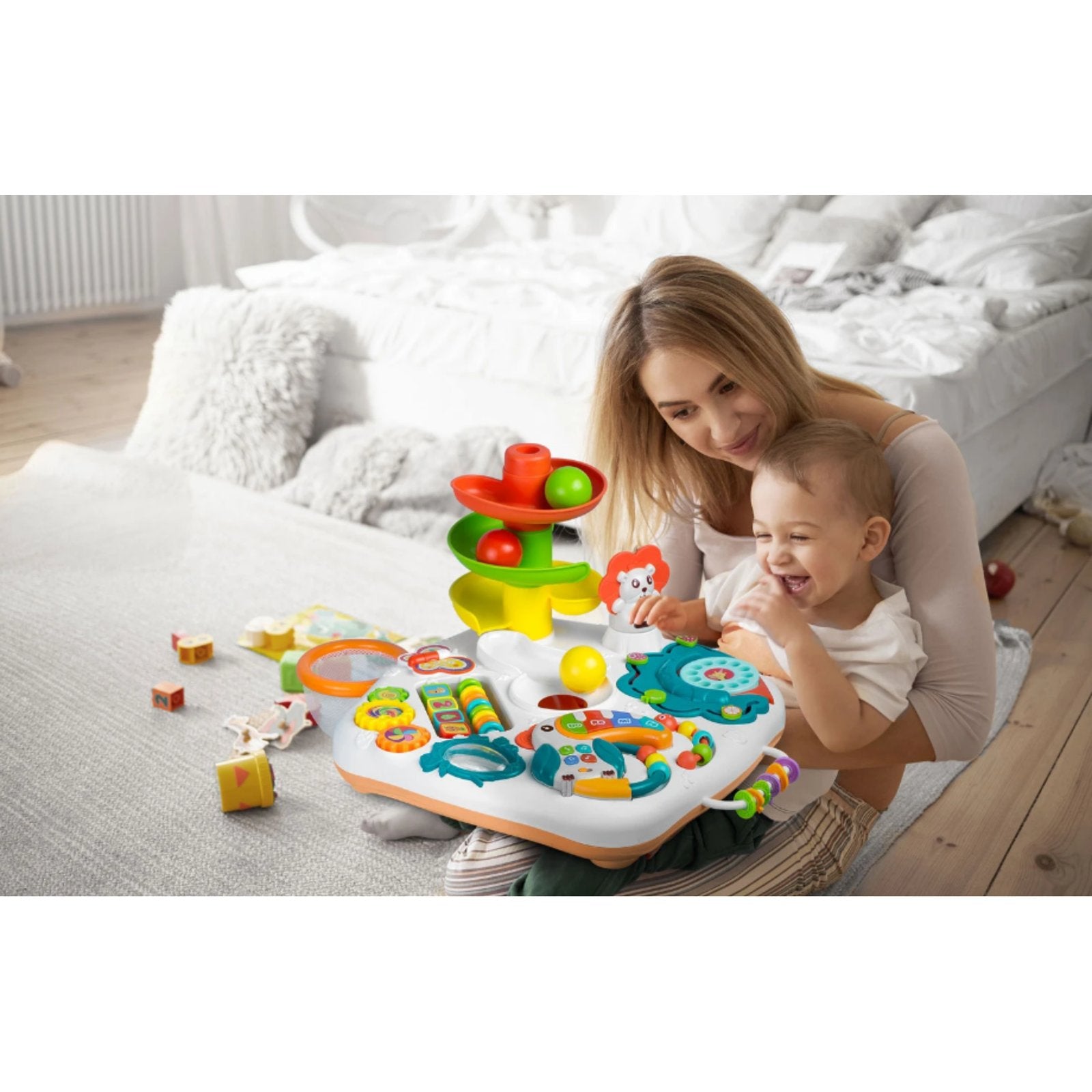 Produsul este ideal pentru a invata numere, culori si forme.Panoul detasabil poate fi folosit ca tabla educationala, iar dupa ce i-ai adaugat picioare, se transforma rapid intr-o masa educationala.