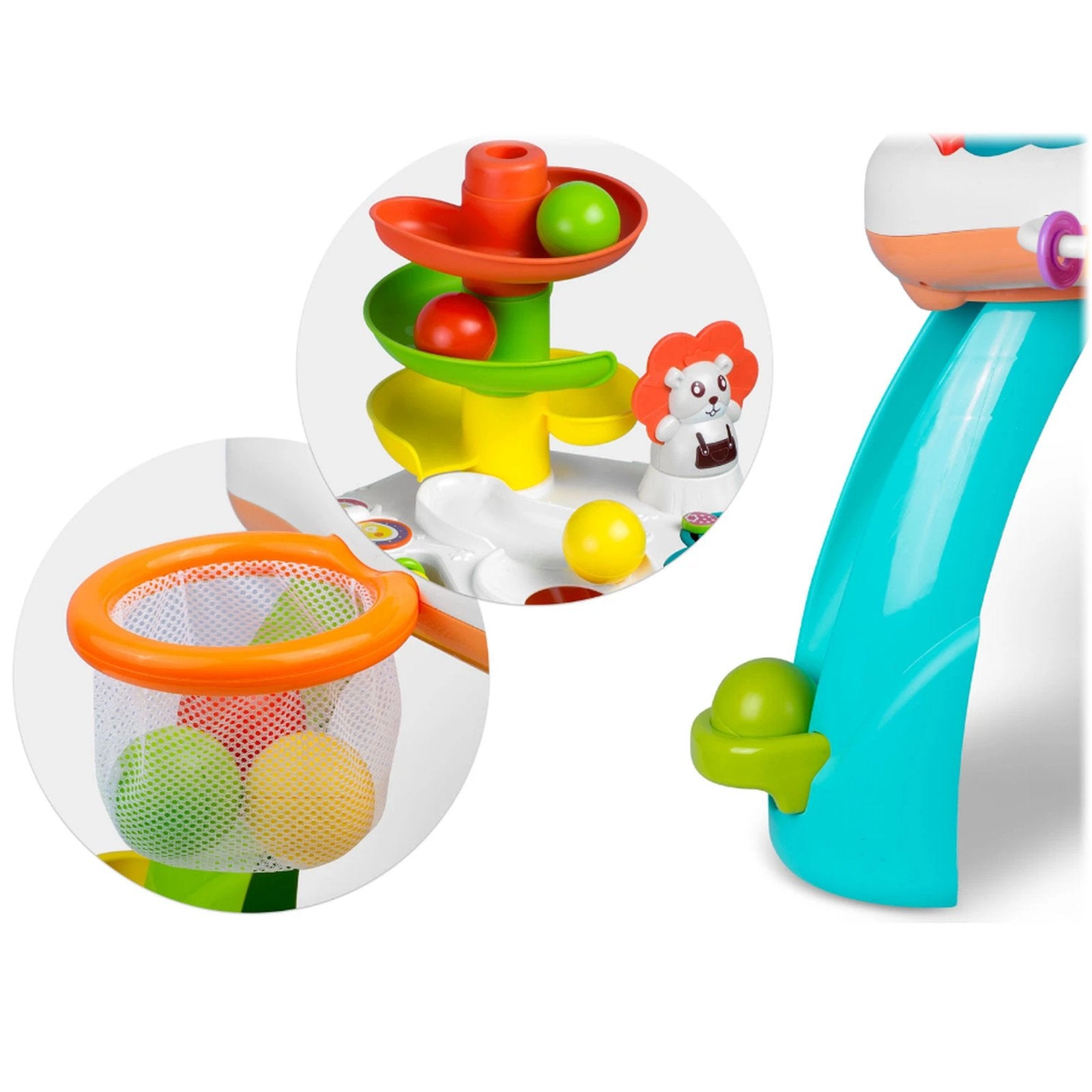 Picioarele mesei au o functie suplimentara de extindere a pistei pentru mingi, iar cosul detasabil va completa marea distractie.
