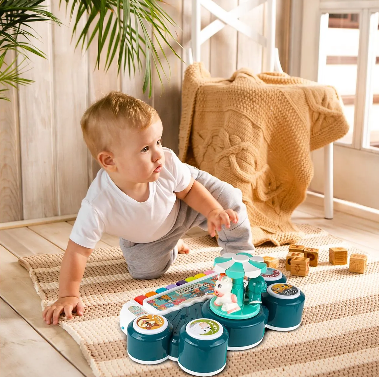 Masuta Educativa pentru Bebelusi 3 in 1 Animal Concert idealSTORE, Include un pian colorat cu lumini si sunete, Carusel cu Animalute, Tobe Muzicale, Comutator ON/OFF, Dezvolta Imaginatia Copilului