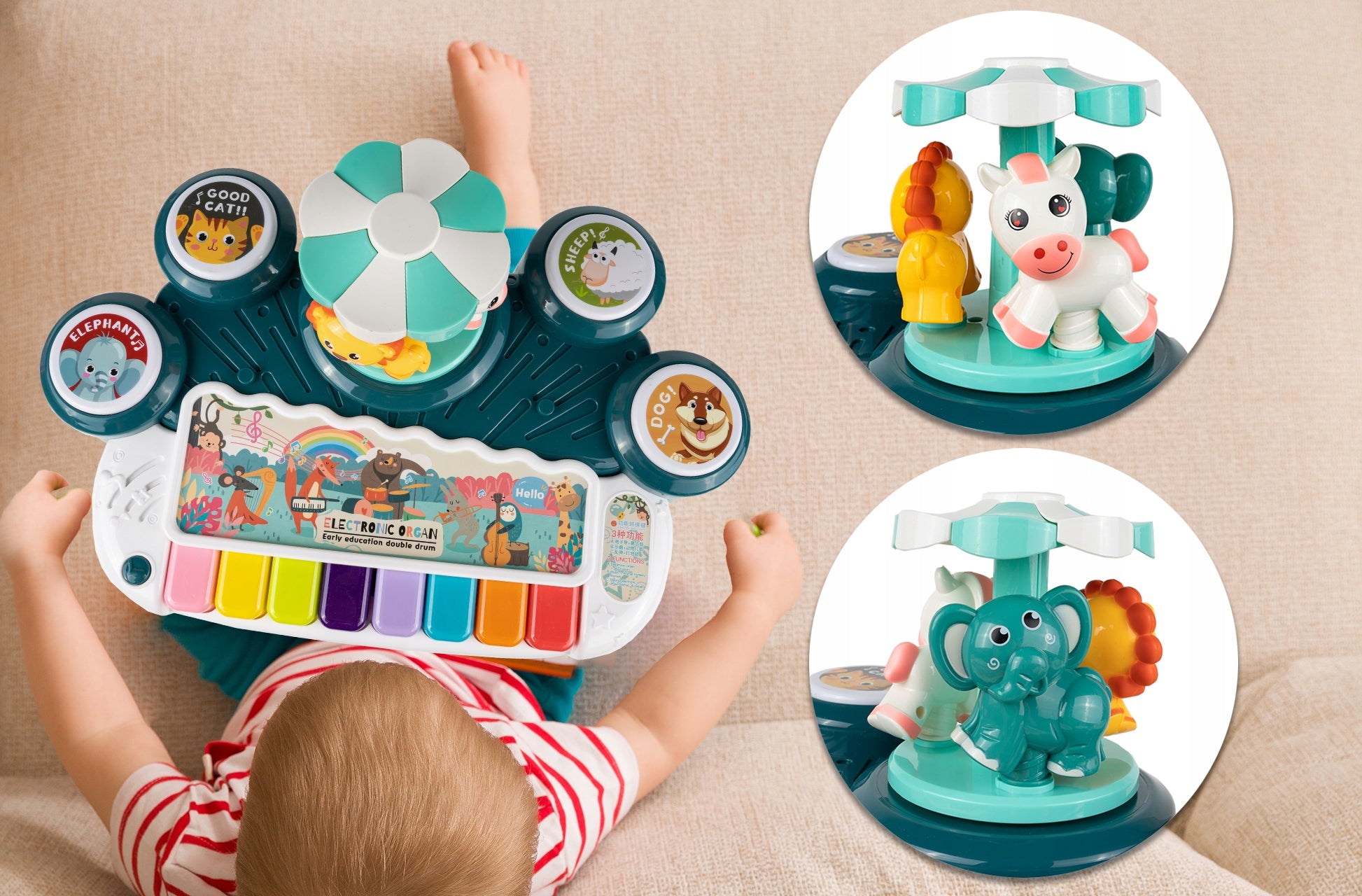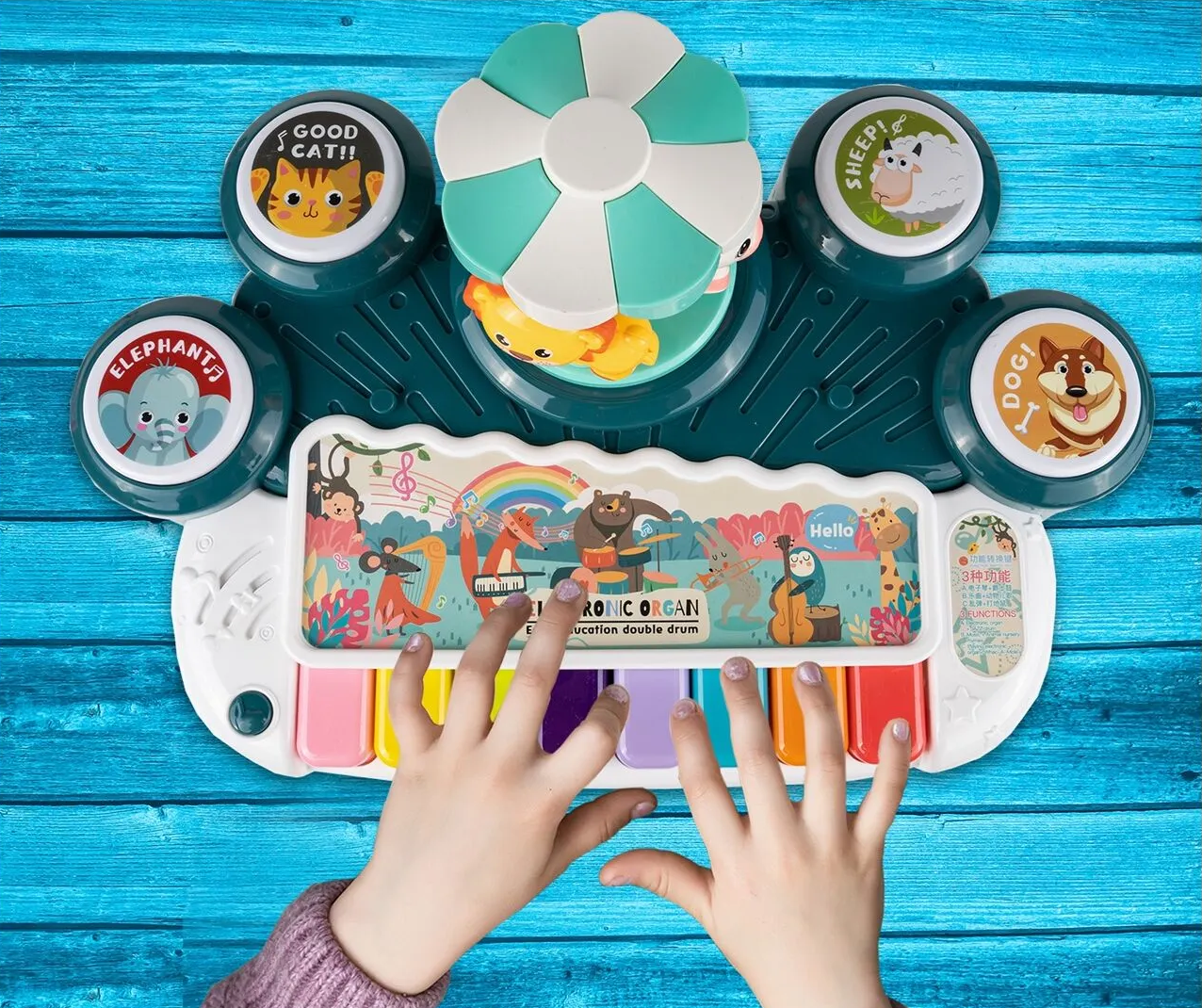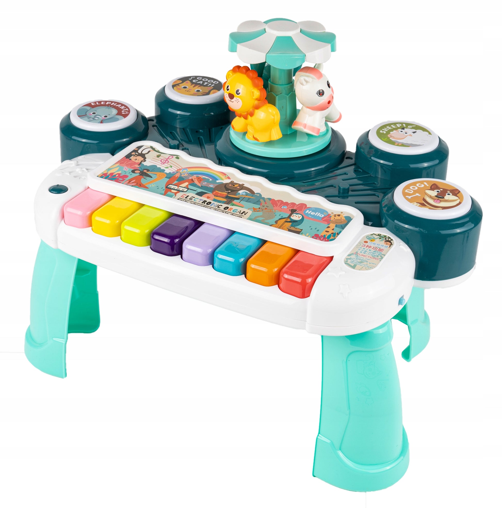 In cea de-a treia functie, copilul poate juca un joc care presupune lovirea tobei potrivite in timp ce scoate sunetele diferitelor animale.