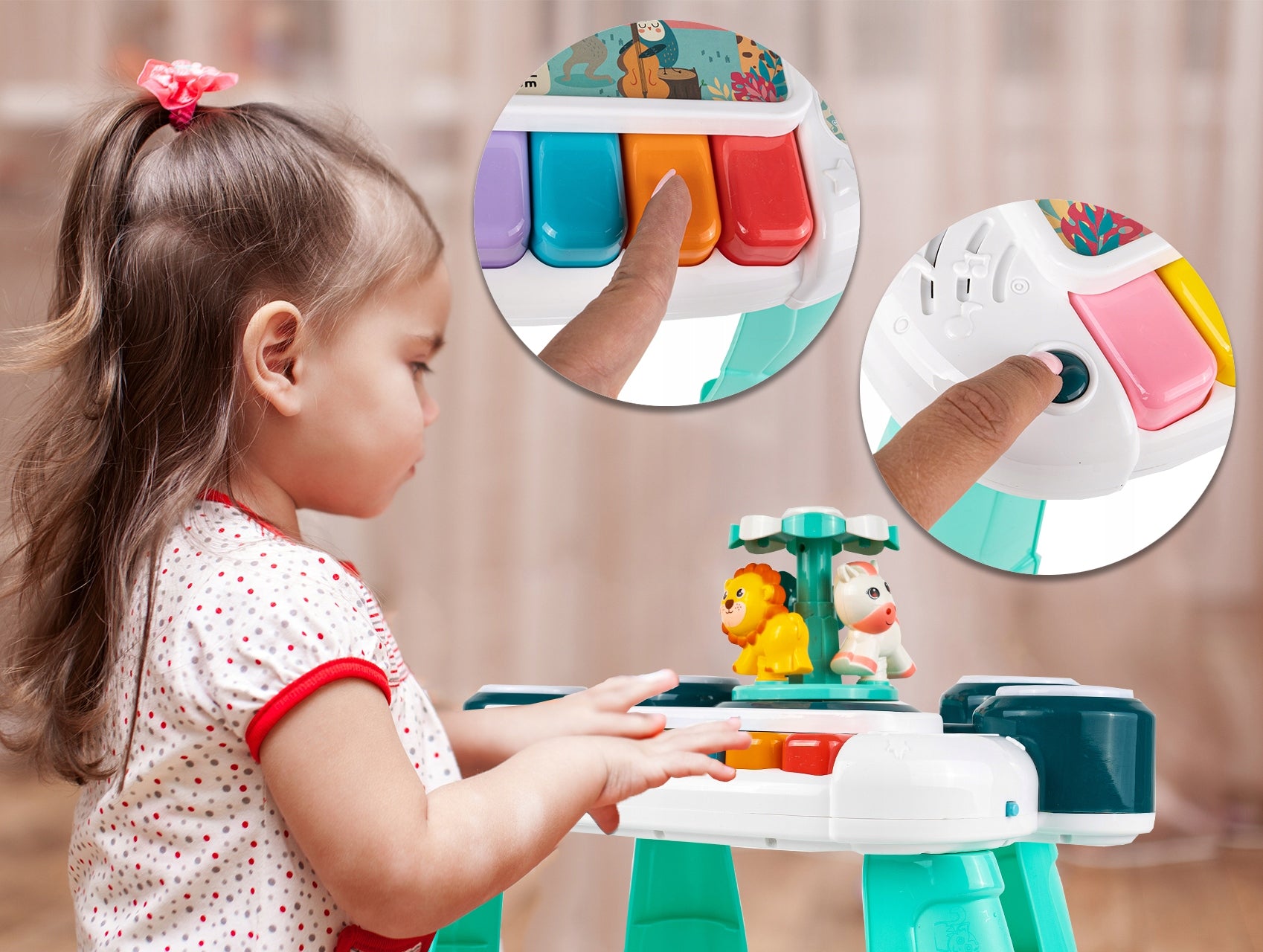Masa educationala ajuta copilul sa se dezvolte prin joaca - cu muzica, lumina si culori.