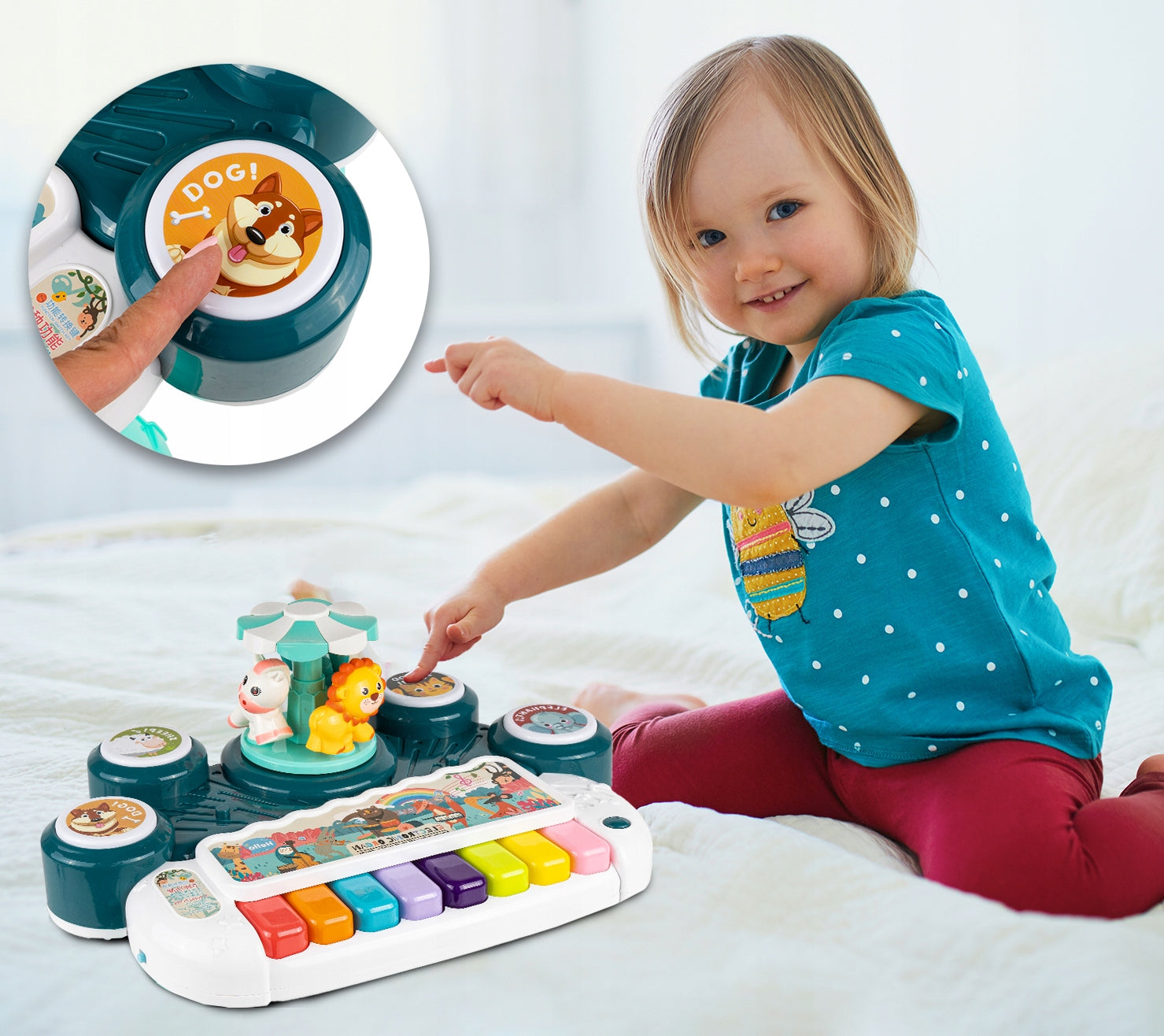 Intreaga distractie este insotita de tobe care stralucesc in diferite culori, un carusel care se invarte cu un cal, un elefant si un leu, precum si o minge disco rotativa care straluceste in albastru, rosu si verde.