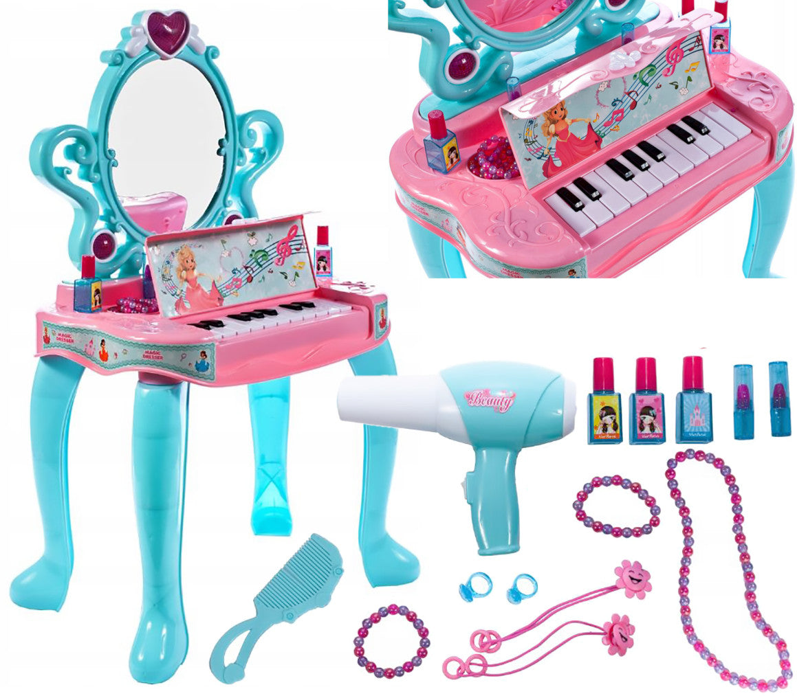 Masuta Make-up cu Pian Piano Dresser idealSTORE, Dimensiuni 73 x 43 x 31 cm, Include Jocuri de lumini si sunete, Uscator, Pieptene, Rujuri, Bratari, Inele, Pian, Oglinda, Produse cosmetice, Creste aspectul de sine prin jocul de rol