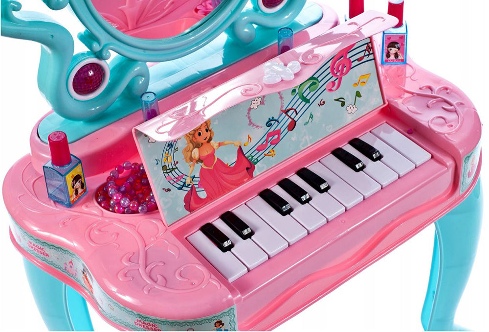 Masuta Make-up cu Pian Piano Dresser idealSTORE, Dimensiuni 73 x 43 x 31 cm, Include Jocuri de lumini si sunete, Pieptene, Bratari, Pian, Oglinda, Produse cosmetice