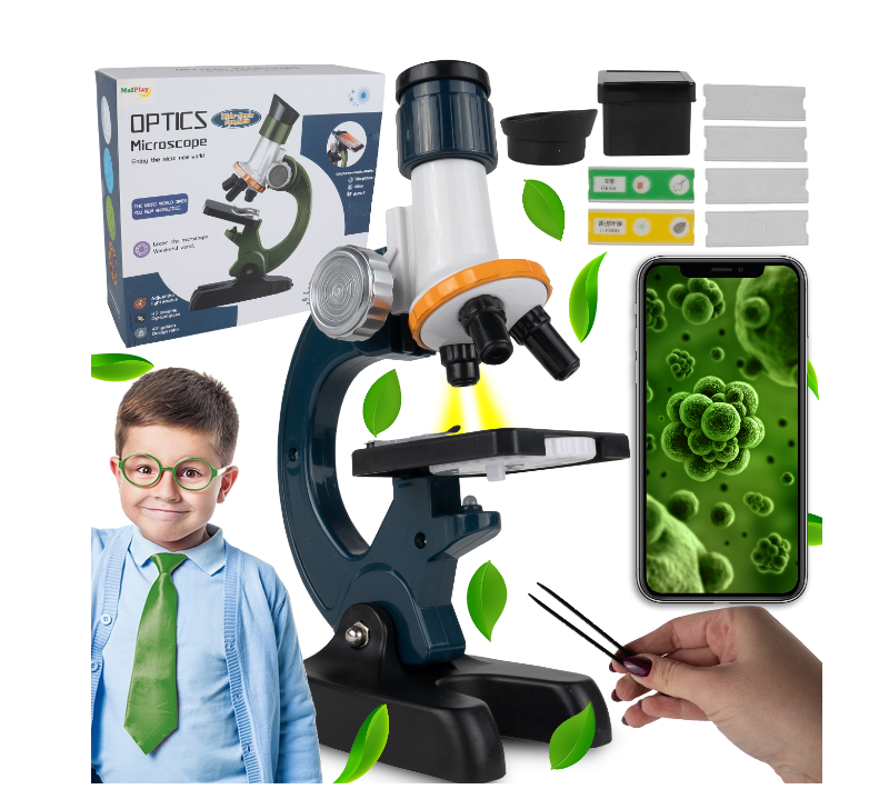 Iti va oferi ore pline de noi descoperiri si cu siguranta va dezvolta curiozitatea si dorinta de a explora lumea din jurul tau. Datorita capului rotativ, microscopul are trei tipuri de marire 100x/400x/1200x. Sursa de lumina este o lampa situata in partea de jos a dispozitivului: va asigura o iluminare adecvata a medicamentului. Acest microscop cu accesorii va incanta fiecare mic om de stiinta. Datorita acestui dispozitiv, lumea microscopica nu va avea secrete pentru noi.