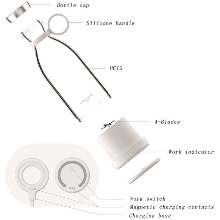 Mini Blender portabil cu acumulator, 50W, 1400 mAh, incarcare wireless, Waterproof, 350 ml, Roz