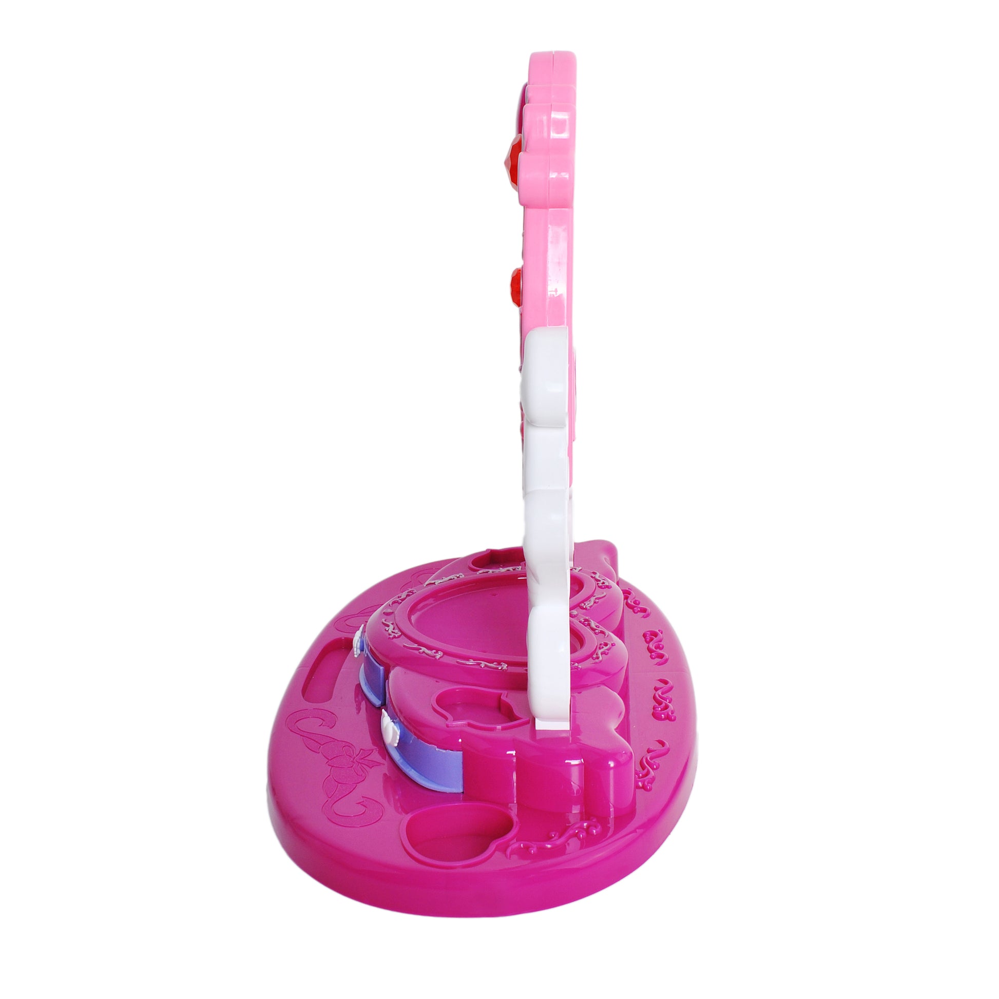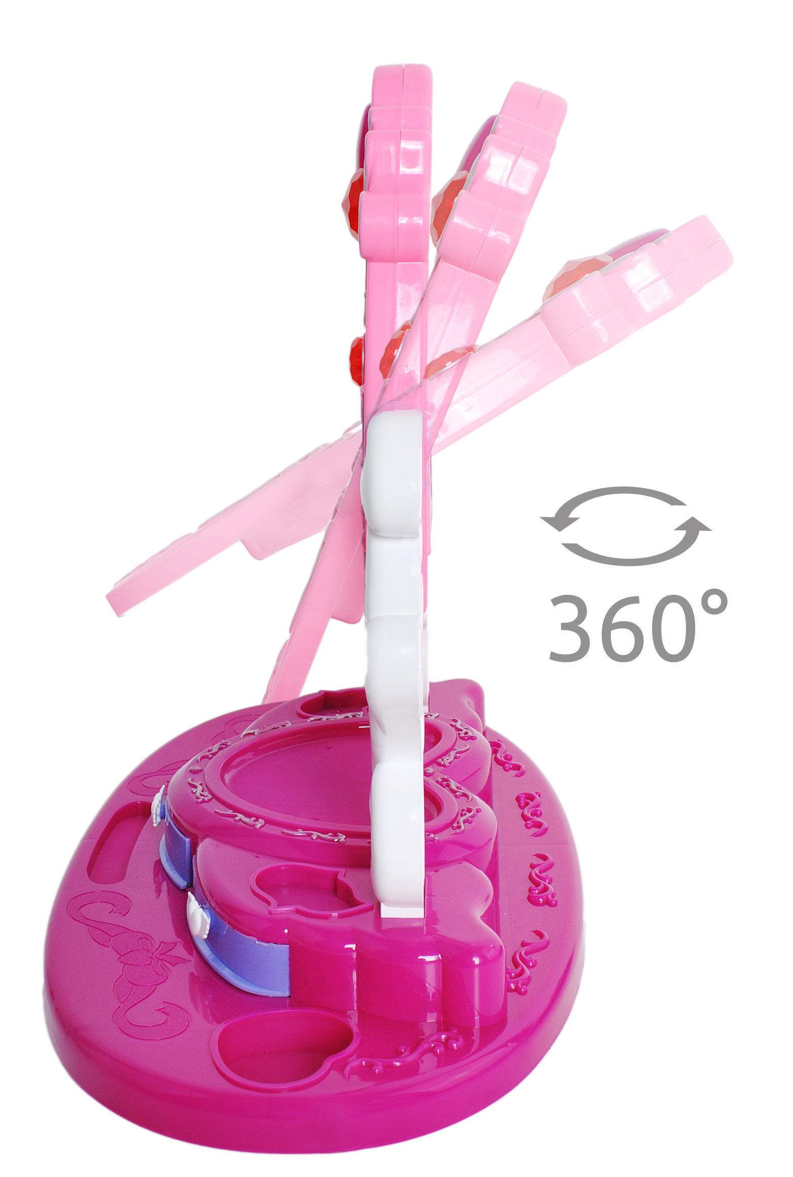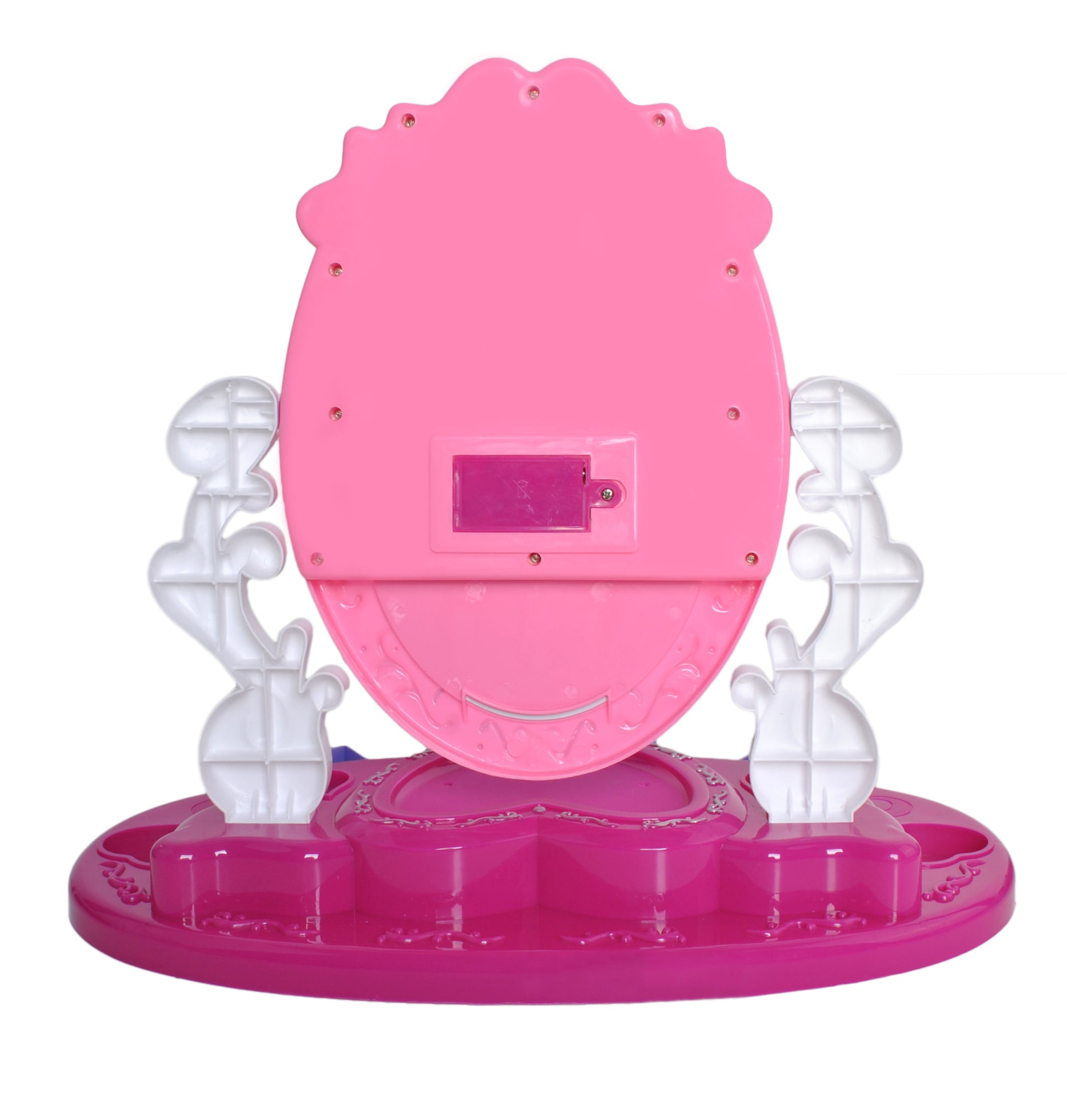 Oglinda cu inclinare reglabila, va va permite sa faceti machiajul si coafura perfecta pentru fetele mai mici si mai mari. Intregul set are numeroase decoratiuni care fac aspectul mai atractiv! Produsul este usor si are dimensiuni compacte, astfel incat un copil poate duce usor toaleta intr-o alta camera, in gradina, loc de joaca sau in weekend la bunici. Apasarea inimii activeaza sunetul si patrunderea luminilor.