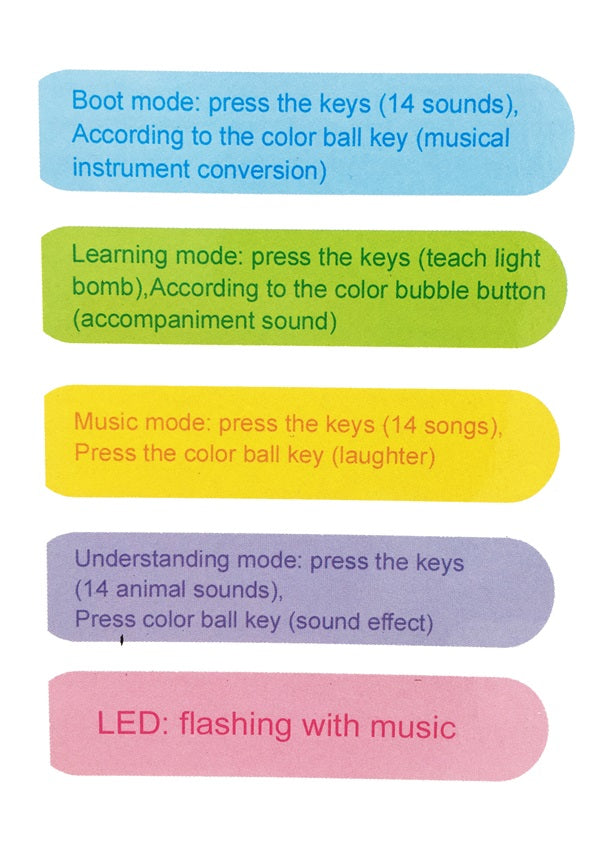 4 moduri: sunete instrumente, sunete animale, melodii si functie invatare
