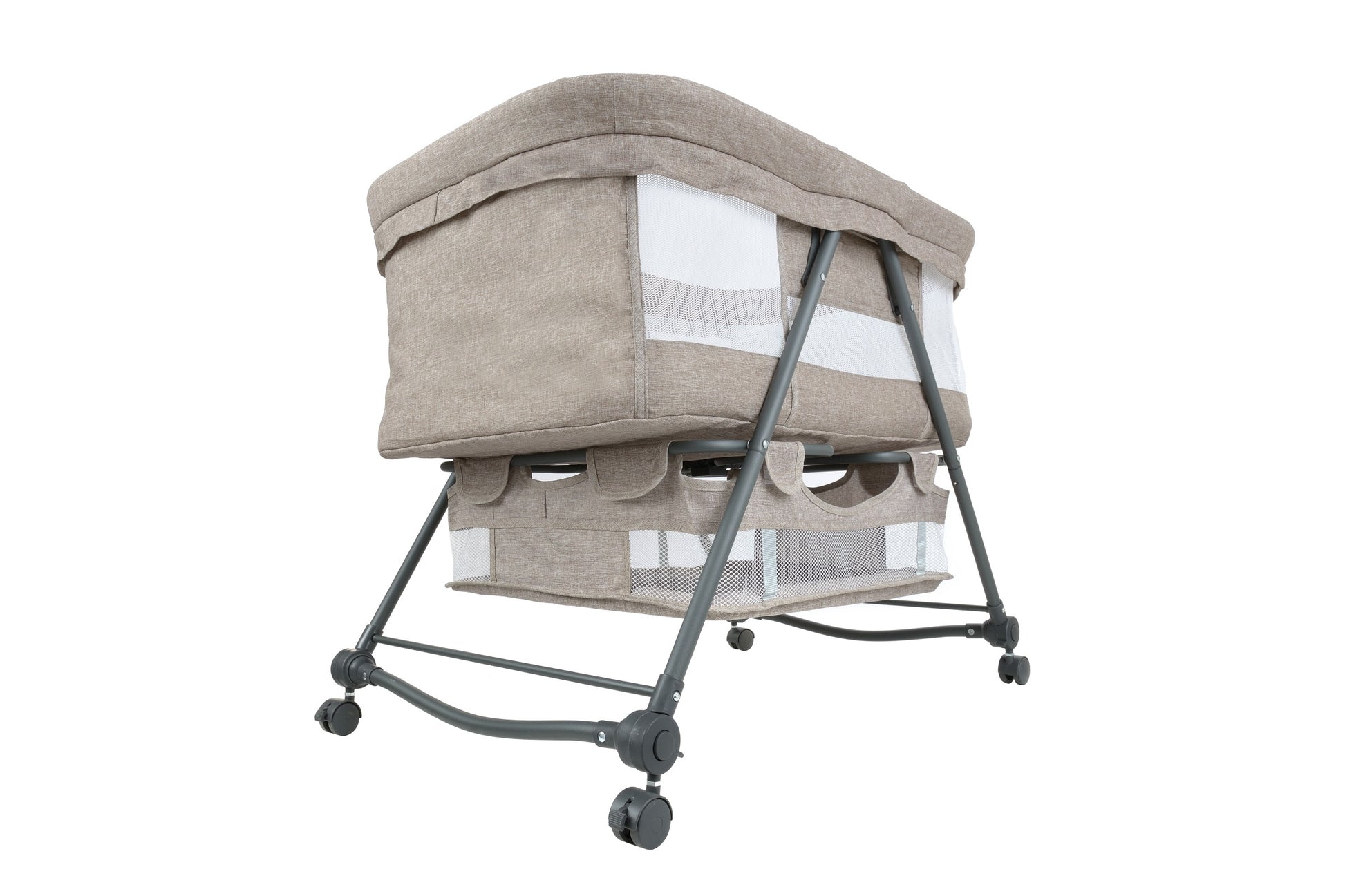 Patut de calatorie pliabil BABY ELIO idealSTORE, Cadru durabil + Tesatura din bumbac respirabila, Saltea reglabila, Include plasa de tantar, cos pentru articole si jucarii, Perfect pentru calatoriile de vara, Sarcina maxima 10 kg, Culoare Bej