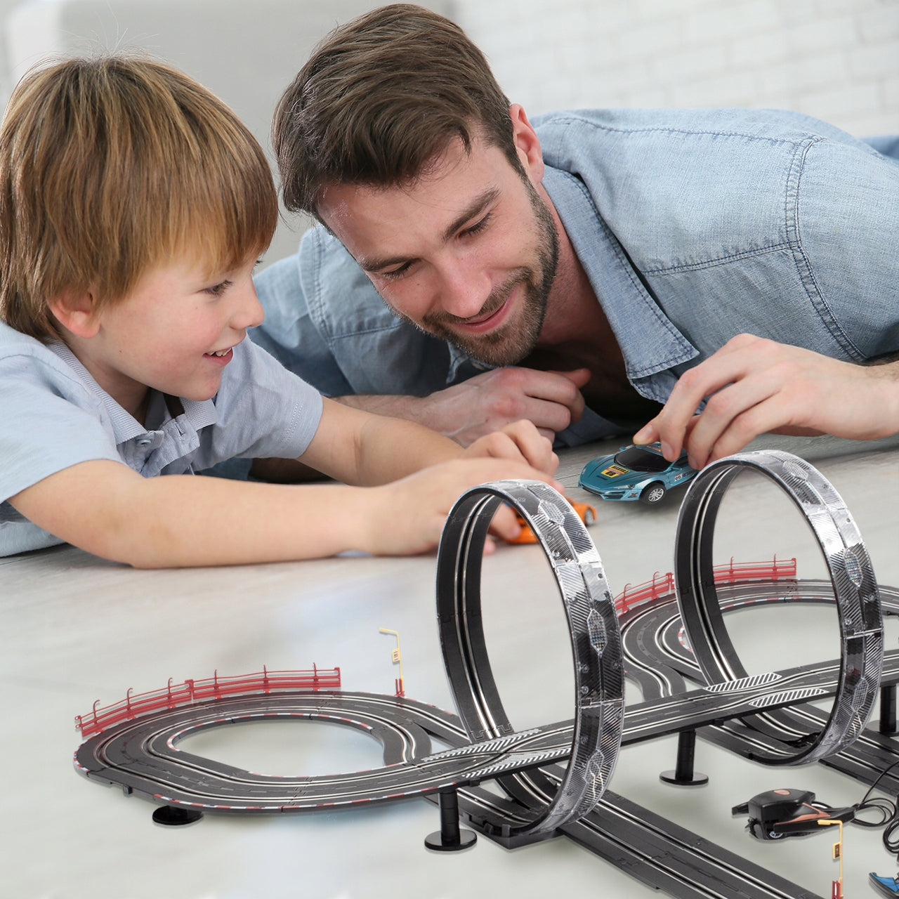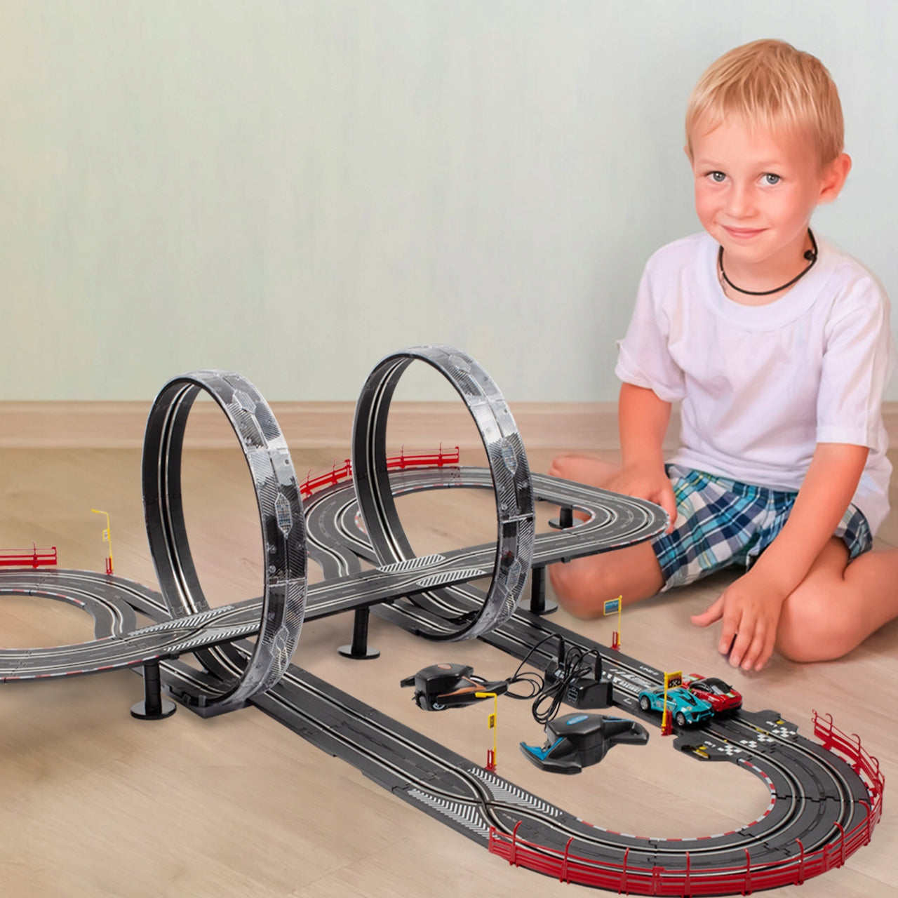 Pista de Curse cu 2 Masini NewYork Race idealStore, 2 Telecomenzi, Bucle Luminoase, Pista Multimodel, Reglare Viteza, Multicolor