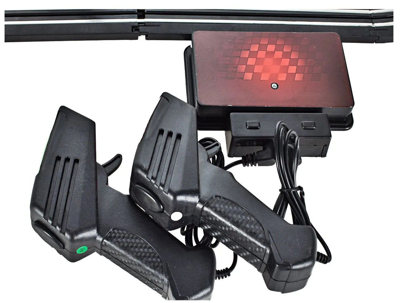 Pe langq elementele necesare pentru construirea pistei, setul include si doua masini care sunt realizate la scara 1:64 si se potrivesc perfect pistei si doua controlere pentru a le controla.