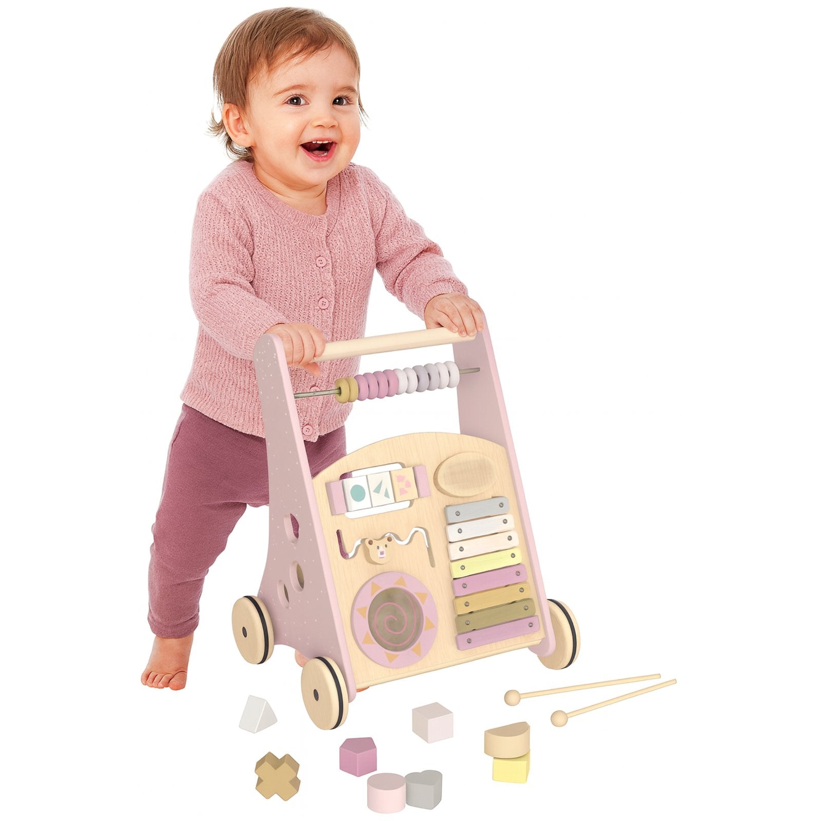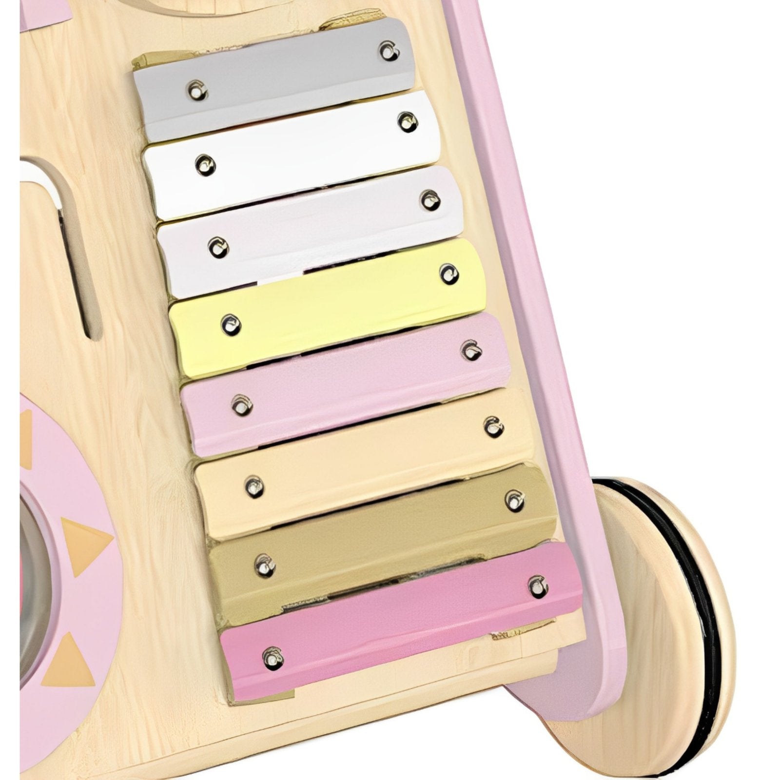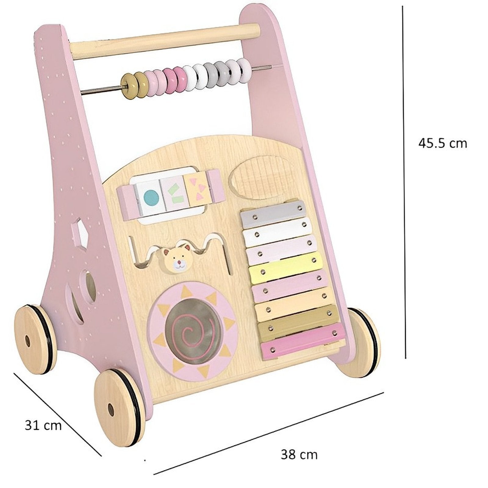 Premergator Song Walker IdealStore, Antemergator pentru Copii din Lemn Natural, 3 in 1, Roti anti-alunecare, Nontoxic, Dimeniunea 38*32*45.5cm, Contine puzzle mobil, Xilofon, Dezvolta abilitati practice, Imaginatia, Culoare Roz