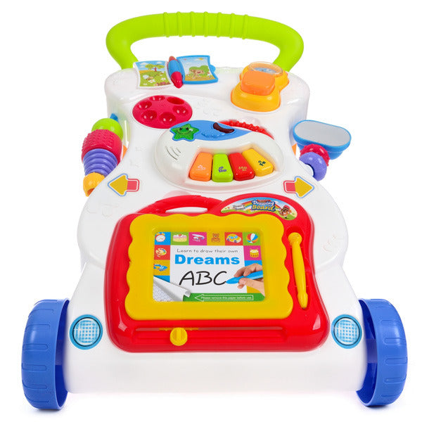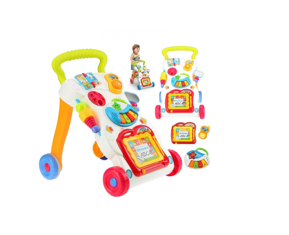Echipat cu jucarii fixe si detasabile. Proiectat pentru copii care invata sa mearga si sa faca primii pasi.