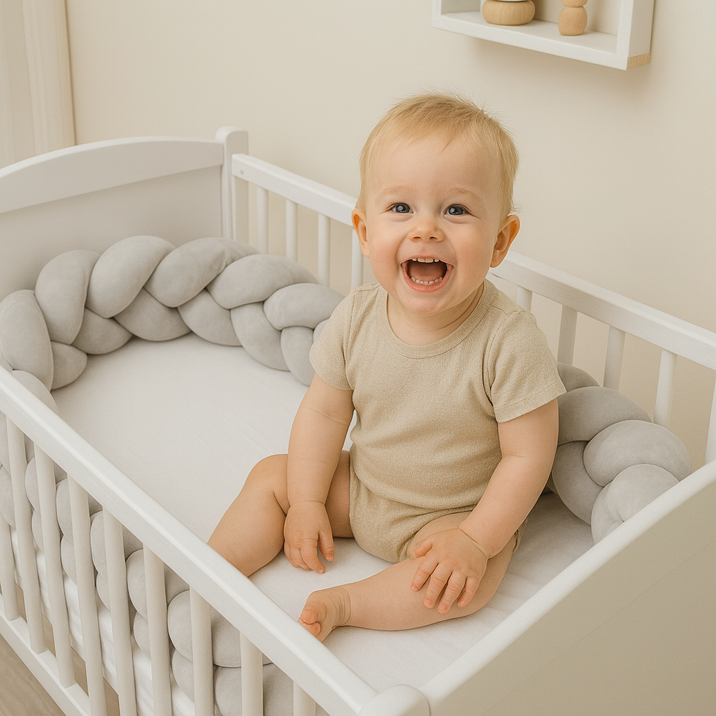 Produsul este umplut cu fibre siliconice antialergenice Baby Soft. Este acoperit de o tesatura din bumbac 100%. Bumperul are suficienta lungime pentru a proteja copilul.