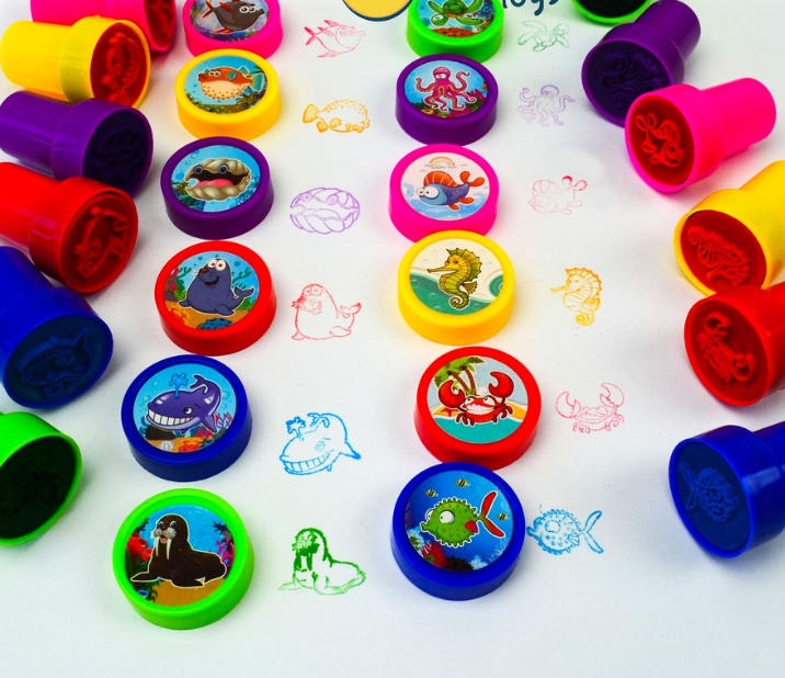 Cerneala de pe stampile este sigura pentru copii. Nu trebuie sa va faceti griji ca, copilul dumneavoastra va avea o eruptie cutanata sau o alergie la contactul cu pielea. In plus, carcasele lor nu au muchii ascutite.