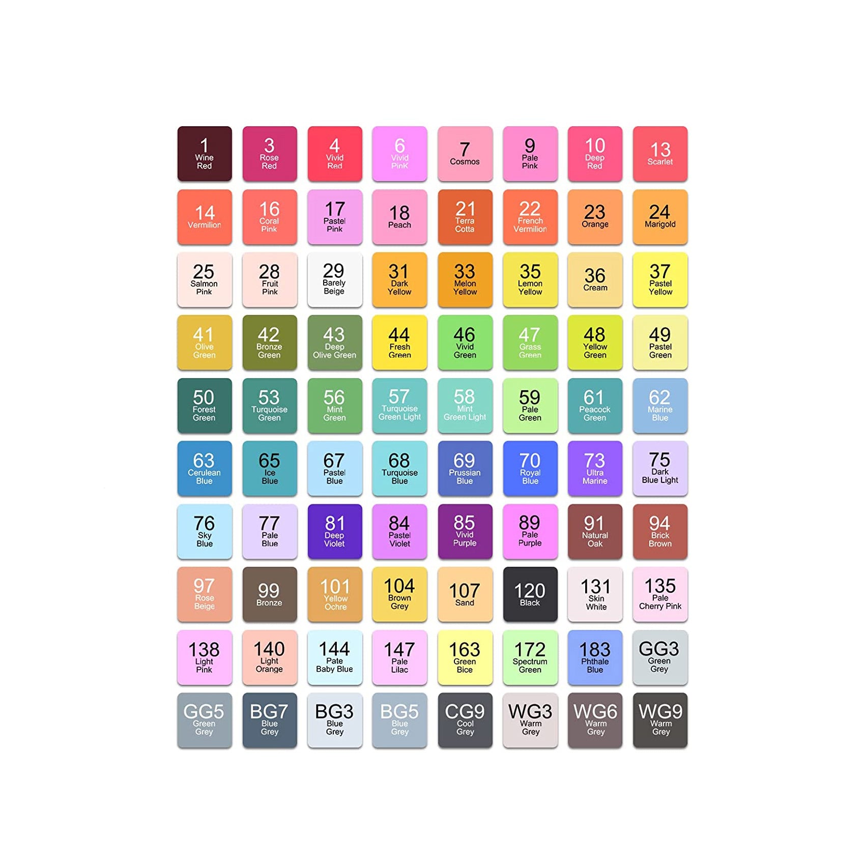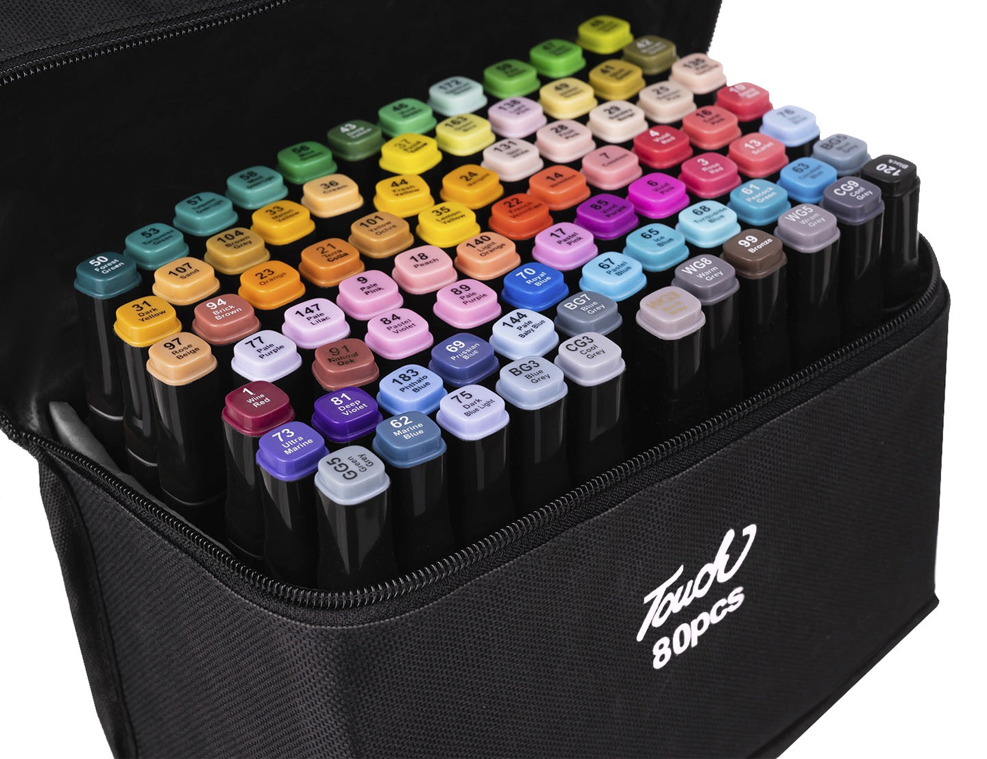 Set format din 80 markere duble in culori intense, suport organizator, geanta pentru depozitare si transport inclusa. Cariocile multicolore au nuantele inscriptionate pe capace, cerneala pe baza de alcool care se usuca rapid si este rezistenta la apa. Fiecare marker are doua capete: unul dintre acestea are un varf subtire, cu scriere de 1 mm - ideal pentru contur, linii subtiri si detalii complexe; celalalt capat are un varf tesit, tip dalta, cu scriere intre 2-6 mm pentru a crea linii mai groase sau pentru a umple spatiile mai ample din desene. Tipul de varf este inscriptionat pe corpul markerelor, astfel ca veti sti in ce capat se afla acesta.