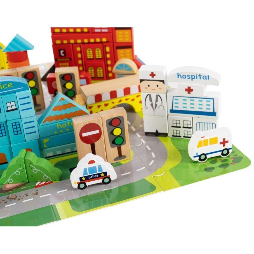 Un set de blocuri de lemn va permite sa va construiti propriul oras, care include diferite tipuri de cladiri .