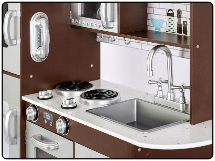 Set bucatarie copii DacEnergy©, realizata din lemn si placa mdf, frigider cu tabla de scris, congelator, cuptor cu microune, telefon, aragaz si cuptor, chiuveta, 92 x 82,5 x 30 cm, gri si maro