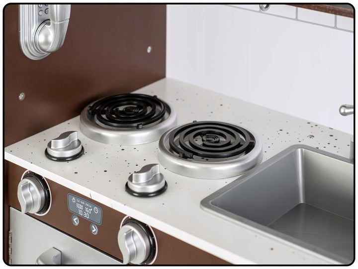 Set bucatarie copii DacEnergy, realizata din lemn si placa mdf, frigider cu tabla de scris, congelator, cuptor cu microune, telefon, aragaz si cuptor, chiuveta, 92 x 82,5 x 30 cm, gri si maro