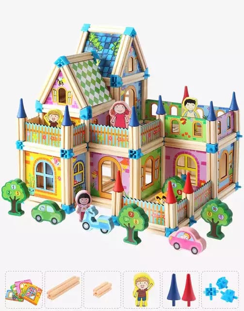 Set casuta de papusi din lemn cu acesorii, 128 piese
