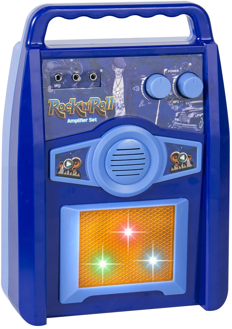 Microfonul cu stativ, chitara si amplificator este o oferta pentru copiii care iubesc spectacolele in fata publicului. In timpul jocului, se aprind lumini intermitente in amplificatorul de chitara si difuzor.